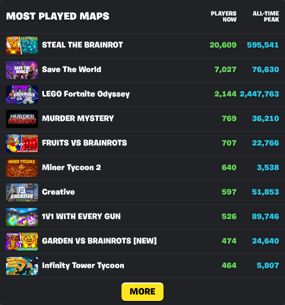 >Fortnitemares 2025 Gameplay Trailerhttps://www.youtube.com/watch?v=AlABOZhCCqU>Fortnitemares 2025 Cinematic Shorthttps://www.youtube.com/watch?v=ieVR7iSGXDs>Fortnite Battle Royale Chapter 6 Season 4: Shock 'N Awesome | Launch Trailerhttps://www.youtube.com/watch?v=yGqbypEMcVA>Bad Bugs vs Power Rangers in Fortnite BR: Shock ‘N Awesome | Live Action Trailerhttps://www.youtube.com/watch?v=7ZIbokU9tRg>Bad Bugs Bite the Bullet in Fortnite Battle Royale: Shock ‘N Awesome!https://www.fortnite.com/news/bad-bugs-bite-the-bullet-in-fortnite-battle-royale-shock-n-awesome>Quests, stats, shophttps://fortnite.gghttps://fortnite.gg/statshttps://fortnite.gg/shophttps://www.fortnite.com/item-shop>LEGO XP AFK Strategyhttps://pastebin.com/YdrVy46s>Season XP Leveling Pacehttps://www.fortnitexp.net/>Mission Alerts for StWhttps://freethevbucks.com/timed-missions/https://fortnitedb.com/>Fortnitemares 2025: A Terrifying New Cast of Horror Iconshttps://www.fortnite.com/news/fortnitemares-2025-a-terrifying-new-cast-of-horror-icons>Fortnite’s Mixtape Music Pass Brings 10 New Jam Tracks!https://www.fortnite.com/news/fortnites-mixtape-music-pass-brings-10-new-jam-tracks>Bringing Hero Classes to Odysseyhttps://www.fortnite.com/news/were-merging-lego-fortnite-expeditions-with-odyssey-by-bringing-hero-classes-to-odyssey>Fortnite Ballistic v37.10 Adds the Veiled Precision SMG, Deployable Wall Gadget, and Morehttps://www.fortnite.com/news/fortnite-ballistic-v37-10-adds-the-veiled-precision-smg-deployable-wall-gadget-and-more>Fortnite Crew October 2025 - Hana Parkhttps://www.fortnite.com/fortnite-crew-subscriptionPrevious:>>544673518