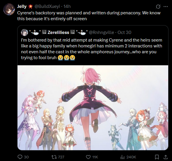 >>544785324But Stelle is not canon. Meanwhile, Cyrene doesn't even seem him worthy of being a part of her memories. Only Caelus is