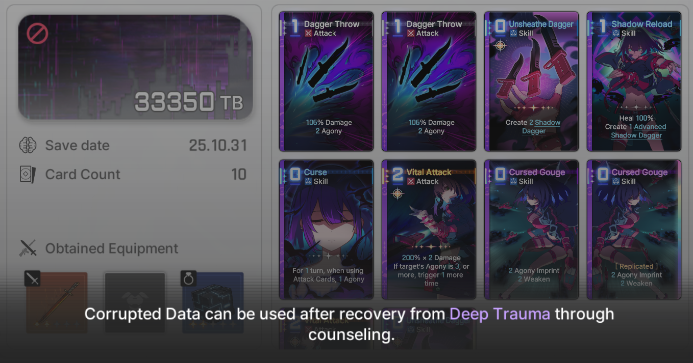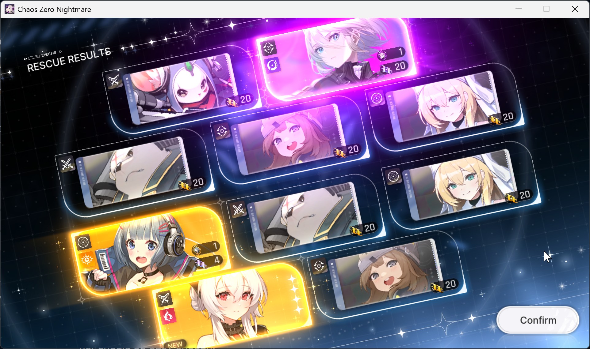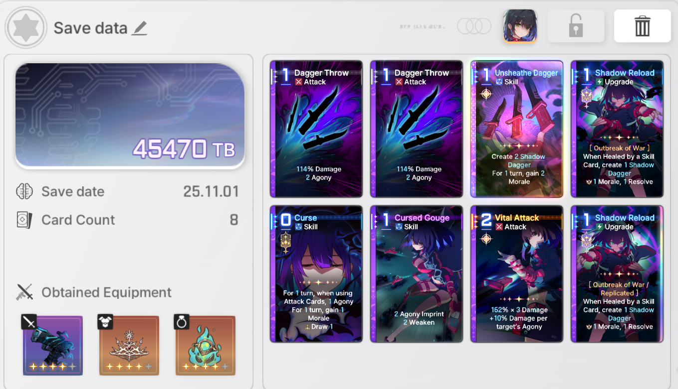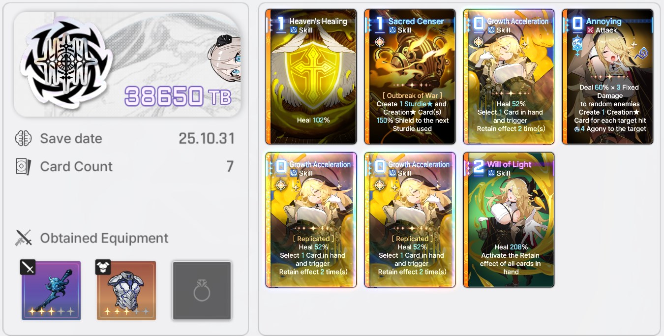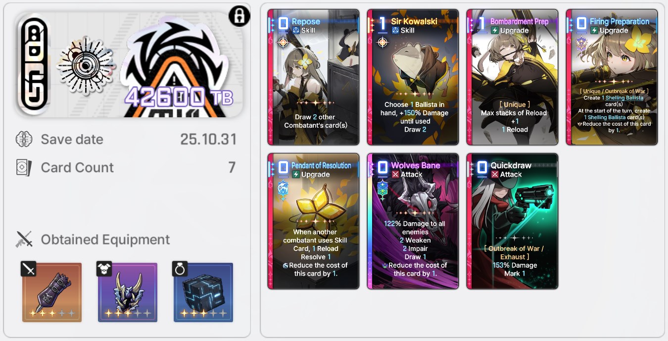 The nightmare is ongoing...>>544751005>Current Featured Banner/Upcoming BannerHaru - Striker - Justice - Until 11/12Yuki - Unknown - Unknown - Leaked/Expected around 11/12>Current Events/Upcoming ContentA Flickering Gleam on a Rusted Anchor - Until 11/12Galactic Calamity Seasonal content (Gives one 5* dupe of your choosing per season) - Expected around 11/12>Basic Guides and Introductionhttps://www.youtube.com/watch?v=B-0CaRtTTpQhttps://www.youtube.com/watch?v=zDFkvOXO2Jg>Deck building simulatorhttps://czndecks.com/>PC Client (Stove)https://www.onstove.com/en/download>Reroll guidehttps://game8.co/games/Chaos-Zero-Nightmare/archives/559640>Reroll tipsReroll Beginner Banner for desired character, Standard banner to guarantee two 5 star start, or reroll for HaruYou have enough rolls to finish beginner banner and one 10 roll on limited banner (You can still luck yourself two 5 stars through beginner banner)>Cards aren't savingCards saving scales to chaos difficulty and if Deep trauma mode is on (purple icon on top right of chaos team formation)