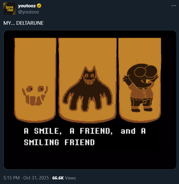 >>544820168It's Halloween, so it's time for the scariest announcement of them all...OFFICIAL DELTARUNE YOUTOOZ ARE BEING TEASED AS WE SPEAK! BOOOO!https://x.com/youtooz/status/1984353546406674607