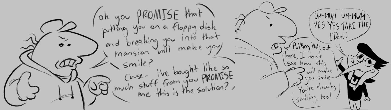 >HE SHOWERS OUR SOULS WITH INCREDIBLE DEALS>AND WITH HEARTY PEEPIS, OUR HEART HE SO STEALS>NO FOOL WOULD BE GREATER>THAN HE WHO DENIES>THAT SPAMTON GIVE ME THE CHANCE TO EARN WILD PRIZE>NOT A CIRCUS CLOWN, WHO'S MORE SICK THAN HE FUNNY>A LOVEABLE SALESMAN, WHO GIVE ME FREE MONEY>YOU MAY ASK, "WHO IS NEXT?">YOU MAY ASK, "WHO WILL BE?">"WHO WILL BE SECRET BOSS OF ADVERNTURE NO. 3?">ME DON'T KNOWS. AND ME DON'T CARES!>ME ONLY CARES ABOUT SPAMTON>THE REST CAN GO UP IN THE AIRS!!Please pay $4.99 to continue the poem.