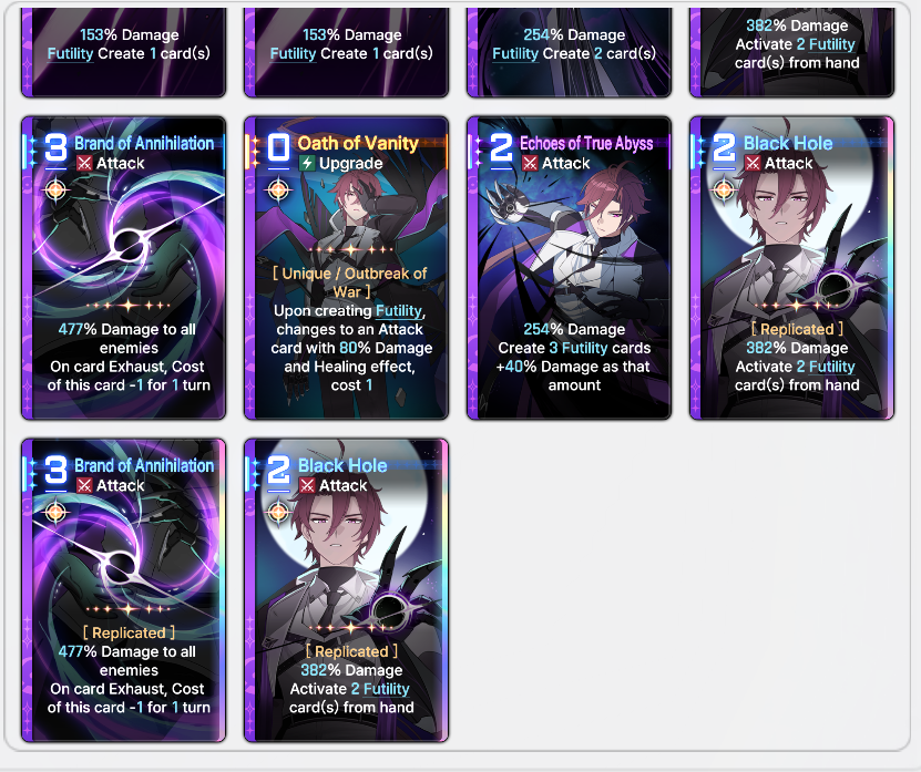 >>544854189the 0 cost echo of futility that gives it infinite scaling based on how many futility made is key to a more AP-light kayron build. instead of NEEDING to burn all your futility for procs, just making them will rapidly scale up your primary burst attack, which happens to now also be free to use. it's the perfect mass-replicate option as well, as it still makes futility cards, so it scales itself.do keep in mind that you will still want to burn your futility for basically every other benefit that brings, just that with that epiphany'd card you won't be so pressured to do so for damage.
