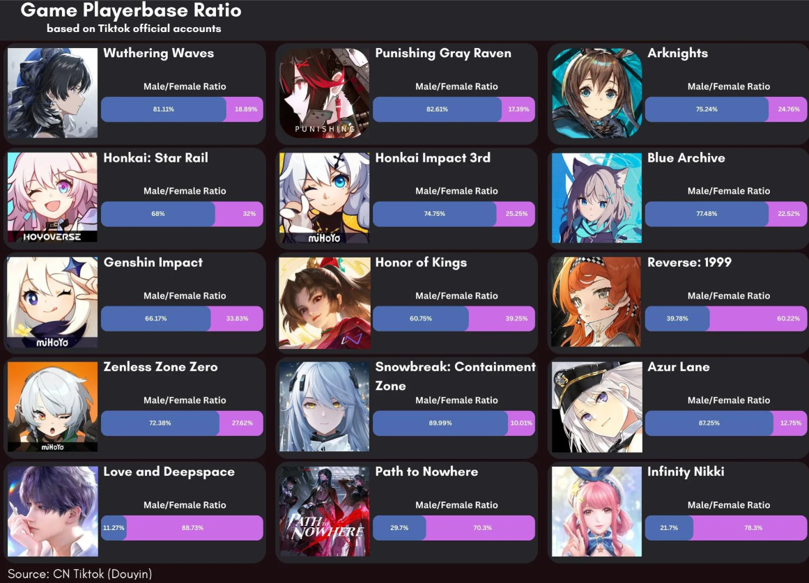 Genshin: 54.425M (CN: 29.425M, GL: 25M)HSR: 22.35M (CN: 9.35M, GL: 13M)LADS: 45.75M (CN: 35.75M, GL: 10M)WuWa: 15.6M (CN: 6.6M, GL: 9M)ZZZ: 12.875M (CN: 6.875M, GL: 6M)FGO: 22.2M +Arknights: 19.65M (CN: 8.25M, GL: 11.4M)