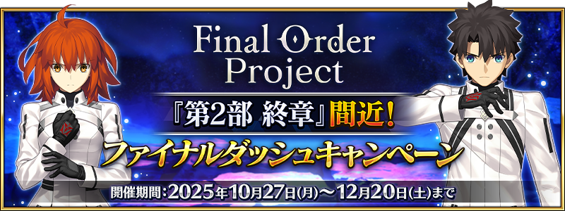 Previous: >>544575754>Evocation Festival Part 14:●October 31 ~ November 14 JST.▶Welfares: Berserker Shizuki Sōjūrō, Lancer Van Gogh (Miner) and Pretender Abigail Williams (Santa).▶Login Bonus: 600 Evocation Leaves and 10 SQ.▶Limited Master Missions: 100 Evocation Leaves, 1 Crystallized Lore, 10 SQ and a commemorative CE.▶Welfare servants:-EXP will be doubled when strengthening.-50% increase in attack and 20% more Bond Points after completing any quest.-Costume dress for Van Gogh has been added to Miss Crane's Dress Making.https://news.fate-go.jp/2025/feasts_cp14/>Evocation Festival Part 14 PU summon:●October 31 ~ November 7 JST.5*Foreigner Van Gogh●November 2~9 JST.Foreigner Abigail WilliamsBoth limited.https://news.fate-go.jp/2025/feasts_cp14_pu/>Part 2 Final Chapter Campaign:●October 31 ~ December 20 JST.▶50 Days Login bonus: The contents of the gifts will be announced from time to time.▶AP consumption of Olga Quests, Sub Singularities and Main Interludes will be 0 if you cleared OC IV.▶Limited Da Vinci Shop lineup.▶4 Limited 5* Command Codes an 3 Mystic Codes will be added to the Rare Prisms Shop.▶AP consumption for Ember Gathering and Training Grounds will be halved.▶When strengthening a servant the chances of getting a Great/Super Success will be doubled.https://news.fate-go.jp/2025/2025_fop_final_countdown_cp/>OVER THE SAME SKY 5 PU summon:●October 27 ~ November 10 JST.▶This gacha will feature 12 servants and 12 commemorative CEs (anything else will be excluded from this PU).▶See the link below for servants and CE rotation.https://news.fate-go.jp/2025/over_the_same_sky_october_pu/>Final Halloween 2025:●Event Period: October 22 ~ November 12 JST (3 weeks).See OP >>544057682>Final Halloween 2025 PUs:See OP >>544575754>/fgog/ Friendlist form (2025):https://forms.gle/WK4dwSC6Mn2WQfZu8>Utility links:https://pastebin.com/iaWmXAq7