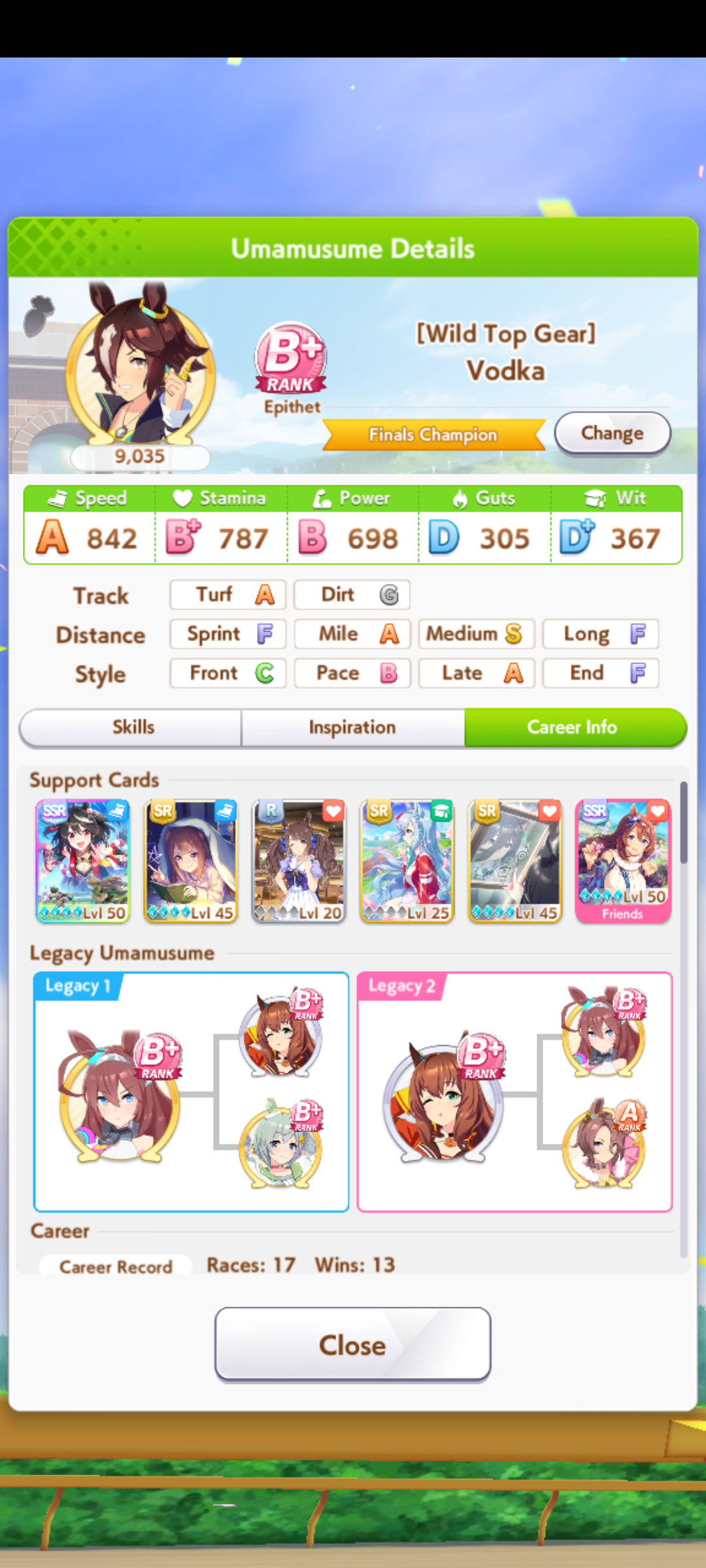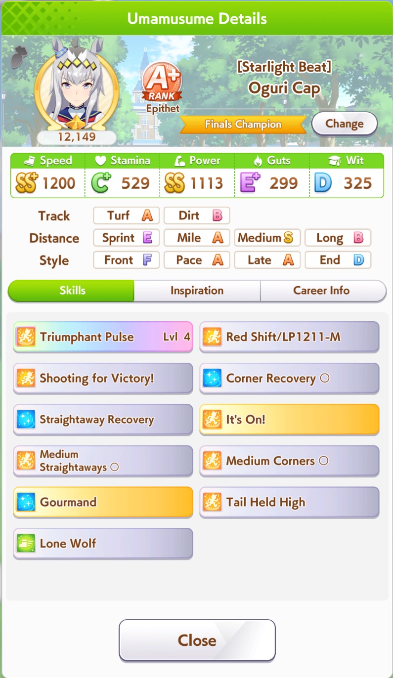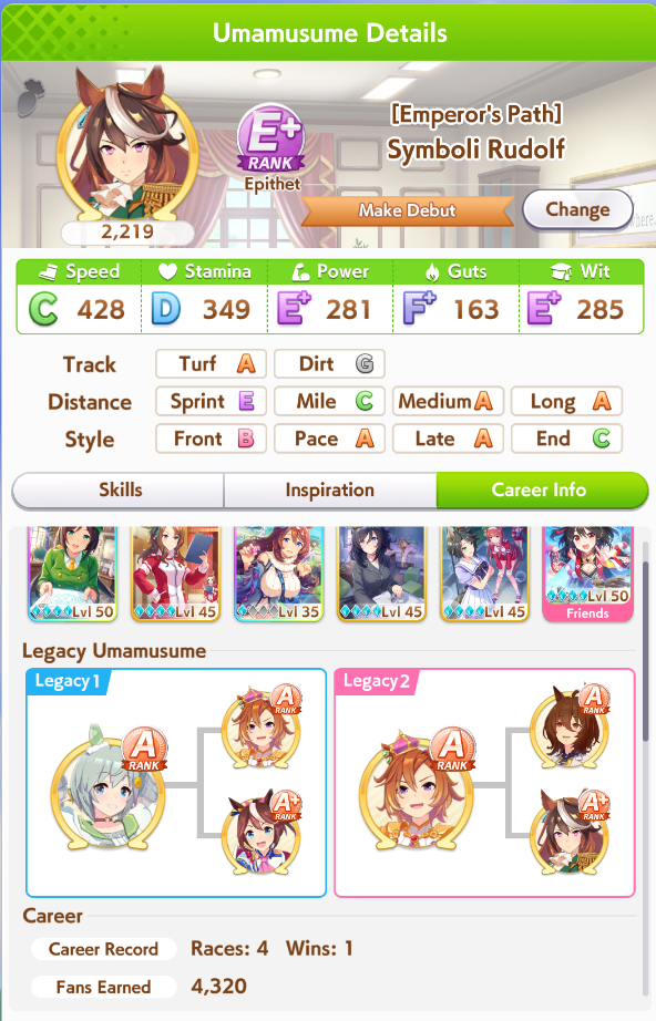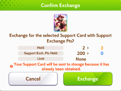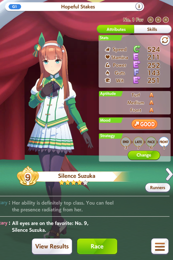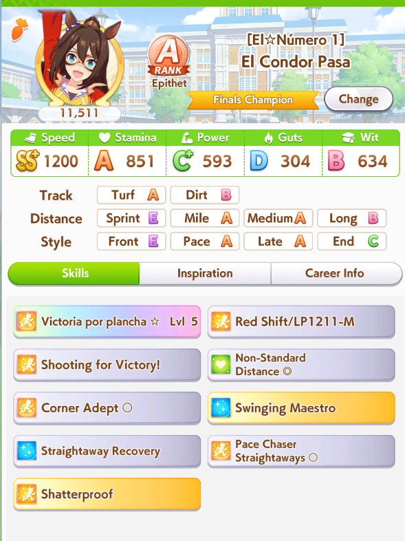 >>544925668I've been meaning to bring that card up. As much as people glazed it when it came out, it looks pretty damn bad to me. Even at MLB there's no initial friendship or mood, just okay training and friendship bonuses, and the skills are all over the place. The events are trash too, -20 energy, some random stats, and Lone Wolf. I don't see any reason to use this over speed SRs like Sweep, Halo, and Flash, or even free Goldship.