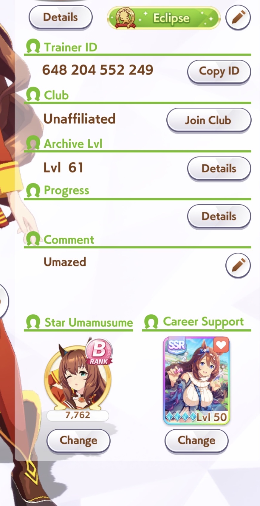 Looking for a new club. I did 100m last month in /uma/club but I am taking a month long vacation this month so I'll be playing more casually. Expect a strong push at the start just to get my numbers up but as soon as I'm on vacation 1mil a day. If I had to estimate I'll probably end the month on 50mil