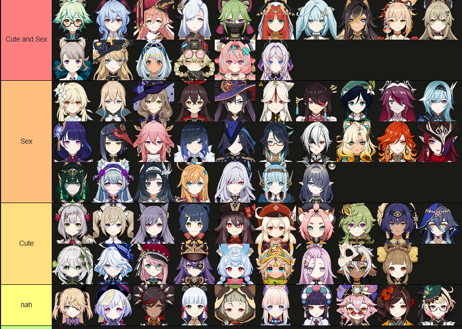 >>544934869>Very rarely does cute and sexy intersectBarbara, Fischl, Noelle, Ganyu, Hu Tao, Yanfei, Yoimiya, Raiden Shogun, Sangonomiya Kokomi, Shenhe, Nilou, Dehya, Lynette, Charlotte, Mualani, Citlali, Escoffier, Jahoda, Columbina, Sandrone
