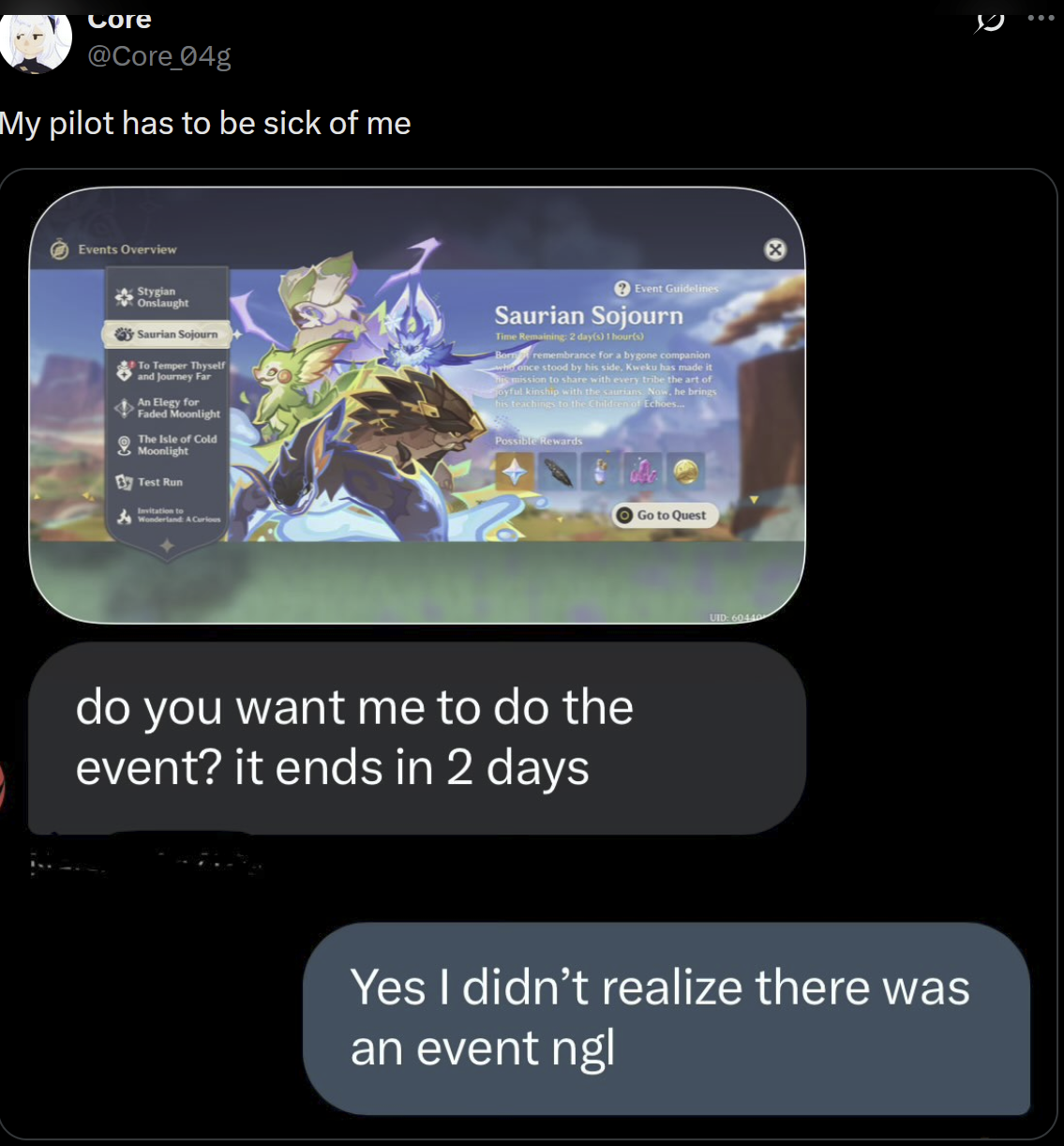 >Everyone knows you're such a spastic and obsessed schizo that you made a private Genshin server just to change your UID to the one you think belongs to your boogieman so you could make a webm of yourself playing badly on purpose.
