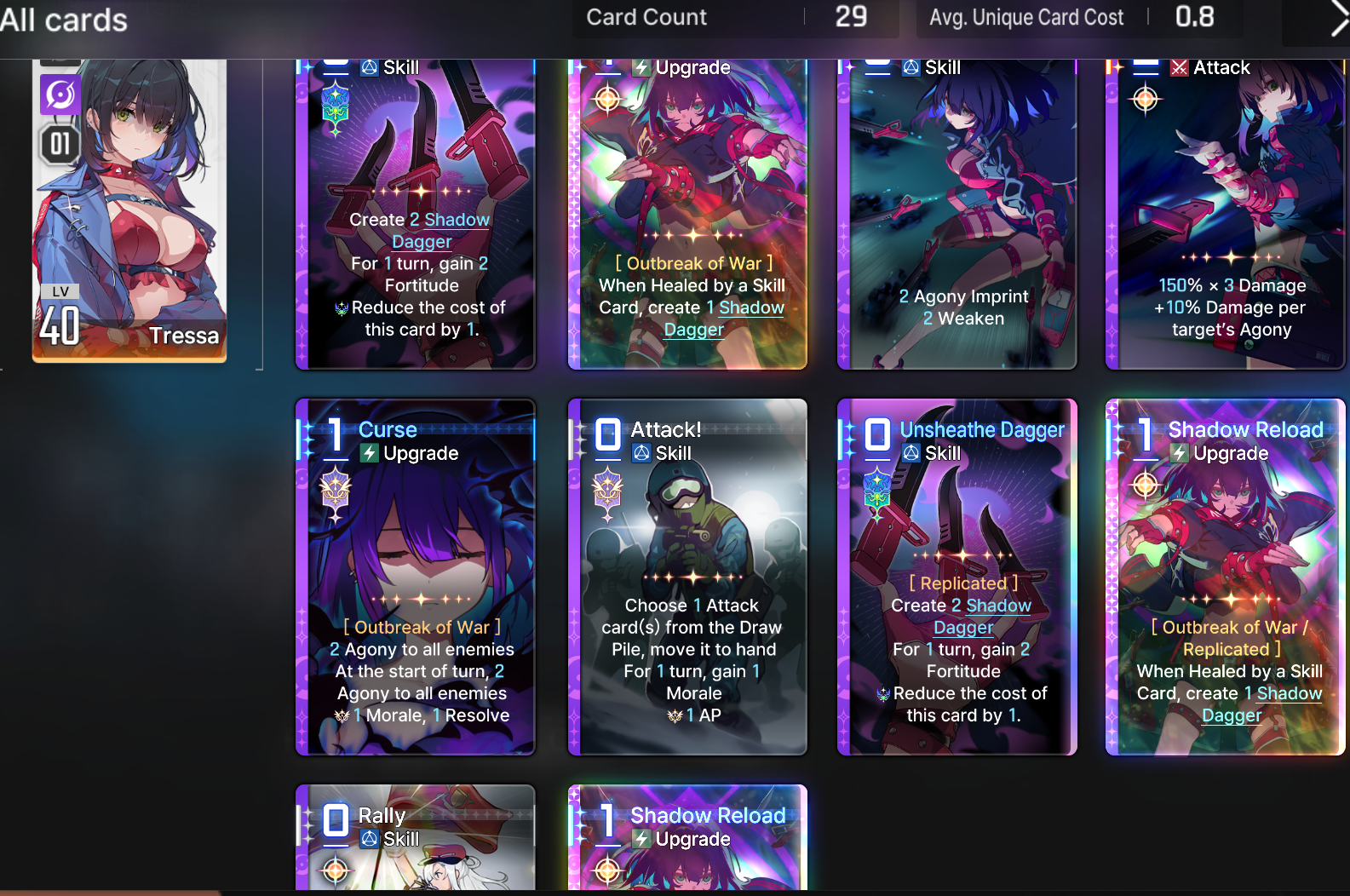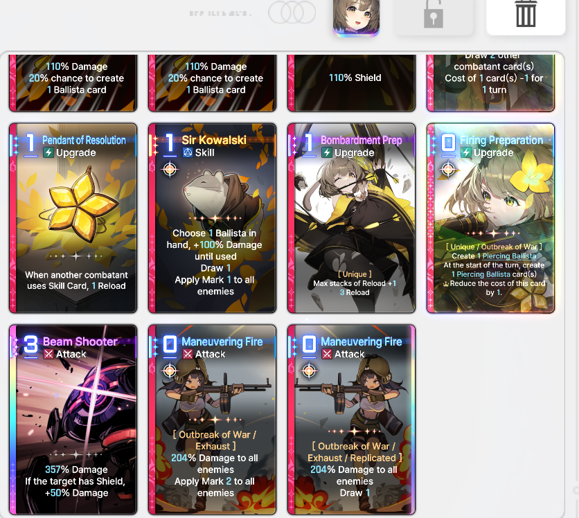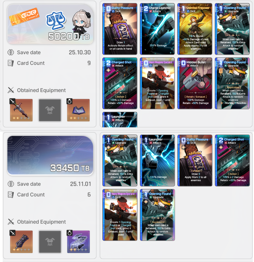 >>544977637Thanks for the advice, anon. I kinda like the lower card counts to cycle faster since once I've used the 2 Opening Found + Guilty Pleasure she will be left with 3 cards 1 of which has retain, Cassius then can help me find Heavy Weapon Specialist to start getting more retain cards to fuel Opening Found.