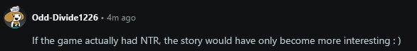 >even r*ddit is genuinely and without a hint of shame posting ntr fanart on the main fucking subredditThis game is fucking finished jesus, it's actually just sad.
