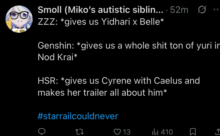 ZZZ: *gives us Yidhari x Belle*Genshin: *gives us a whole shit ton of yuri in Nod Krai*HSR: *gives us Cyrene with Caelus and makes her trailer all about him*