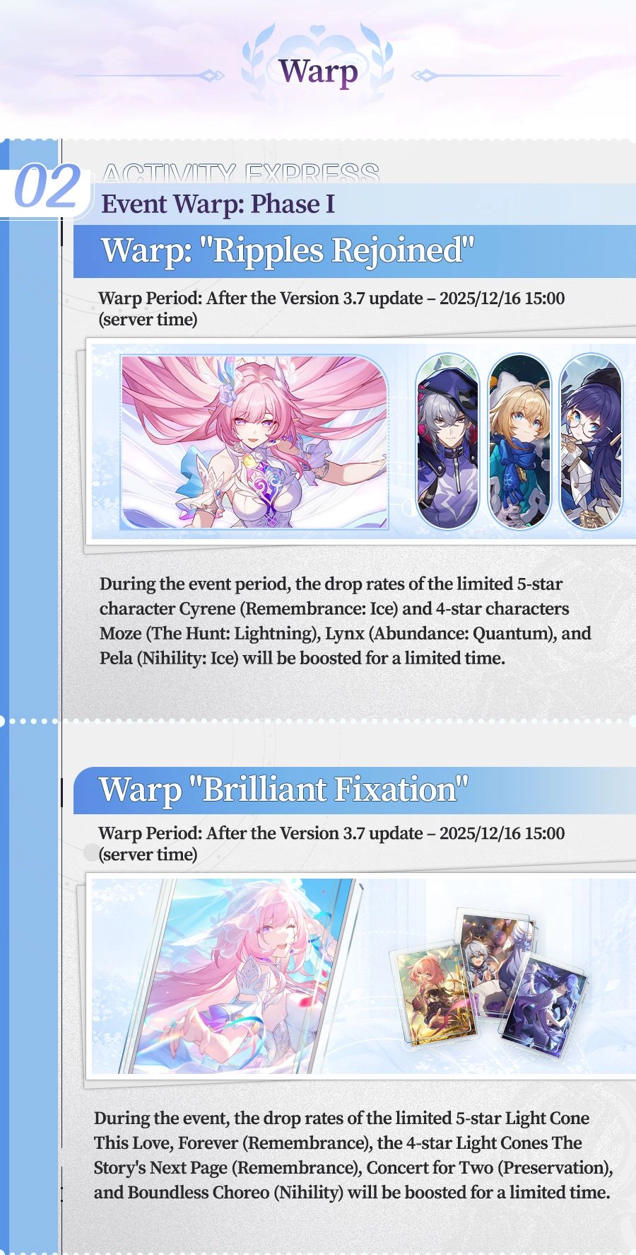 Previous: >>544976472>Version 3.7 "As Tomorrow Became Yesterday" Special Programhttps://www.youtube.com/watch?v=Sx7xZp96nZMhttps://www.youtube.com/watch?v=15x3KOhWsf4>Download - https://hsr.hoyoverse.com/en-us/home>3.7 Preview Page - https://act.hoyoverse.com/puzzle/hkrpg/e20251024vesion_1316/index.html>Version 3.7 Trailer: "As Tomorrow Became Yesterday"https://www.youtube.com/watch?v=r4gljUbCzqAhttps://www.youtube.com/watch?v=-L1PxKwvJ74>Cyrene Character Trailer: "With You Once More"https://www.youtube.com/watch?v=CRAuK8T6Xishttps://www.youtube.com/watch?v=rtSkMbDs1Xw >Golden Epic Trailer: Farewell, Cyrenehttps://www.youtube.com/watch?v=Sn901sn5_B0 https://www.youtube.com/watch?v=zHFGsd-KsX0>Myriad Celestia Trailer — "Exotale: Scene 8"https://www.youtube.com/watch?v=x3bRer52asEhttps://www.youtube.com/watch?v=owFII5A3OfE>Current Character Banners: Dan Heng • Permansor Terrae, Anaxa + Sushang, Hanya, Serval - https://www.hoyolab.com/article/41743443>New Drip Marketing:>The Dahlia (5* Fire Nihility) - https://www.hoyolab.com/article/41861857>Redeemable Codes - https://hsr.hoyoverse.com/gift9BJ8YE37HM8BFREEDANHENGSTARRAILGIFT>/hsrg/ Tools & Resourceshttps://rentry.org/hsrg-resources-14>/hsrg/ Thread Templatehttps://rentry.org/hsrg-thread-template-14
