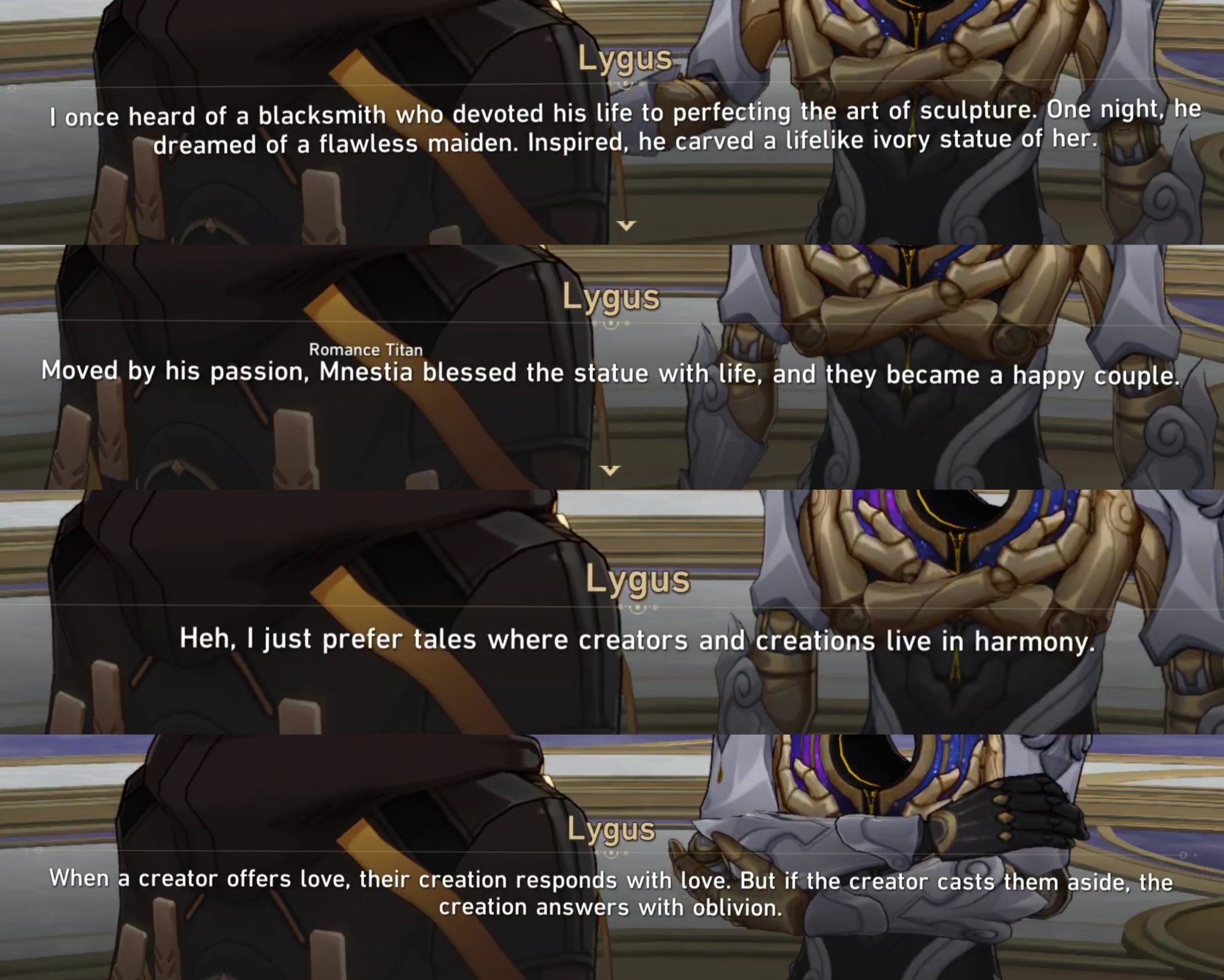 >>544994163>our first connectionIrrelevant. The connection is relevant only to Amphoreus itself. Mem is tethered to the player, sensible. But this does not matter one bit for the RELATIONSHIPS within the world. So I feel very little for Cyrene as a character within Amphoreus.