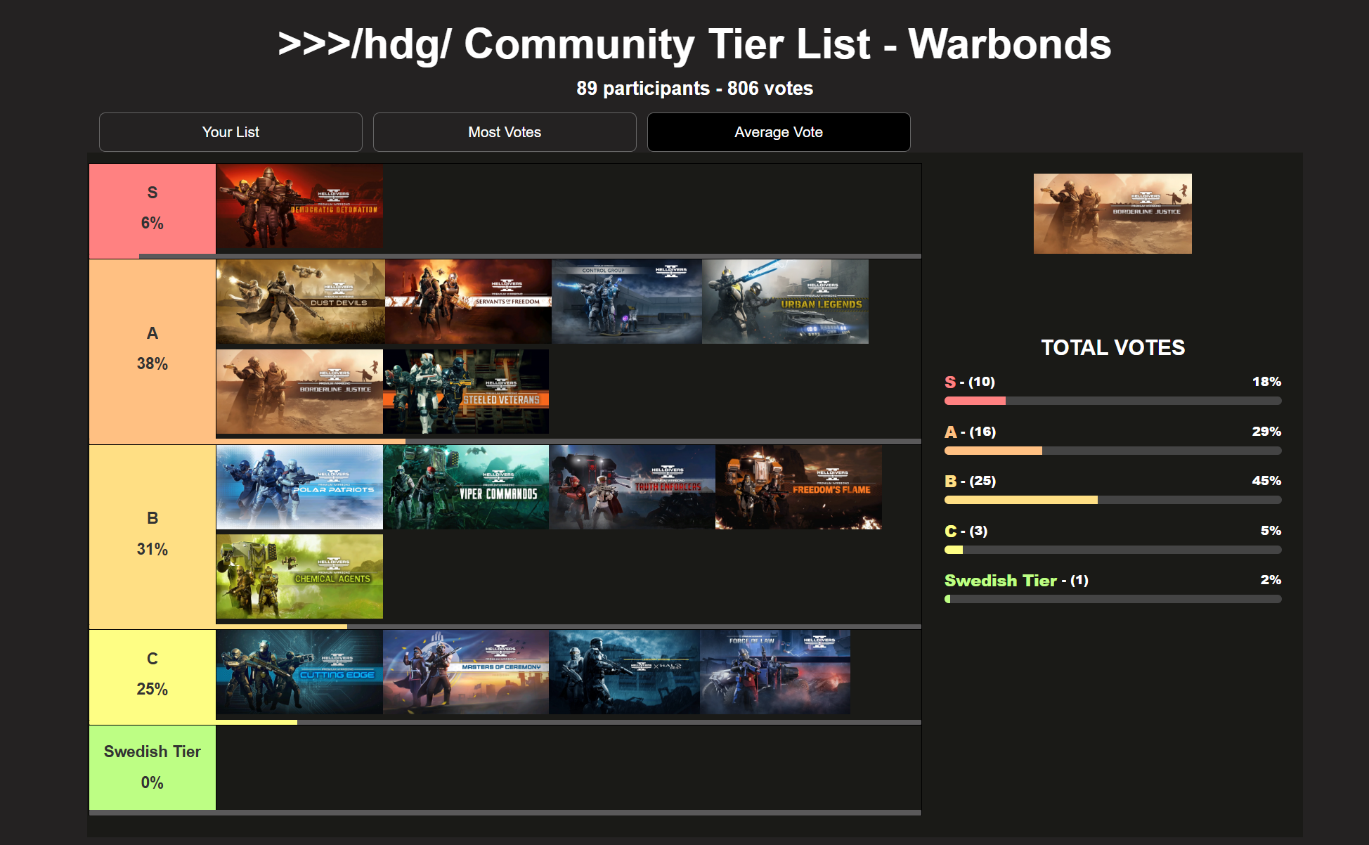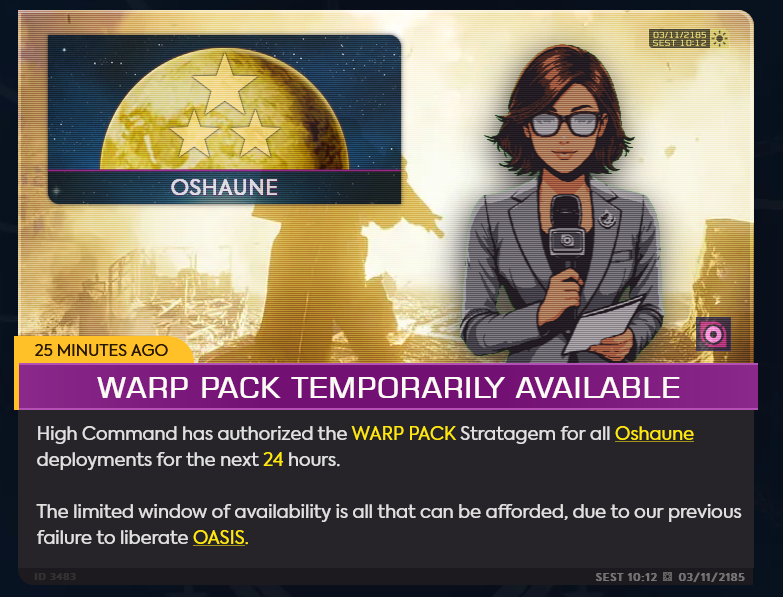 >Previous>>544962397 >WHAT IS HELLDIVERS 2?HELLDIVERS 2 is a 2024 crossplay, co-op, squad-based, PvE 3rd person shooter for PC, PS5 and XBox Series X/S where players fight against hordes of alien insects, robots and squids to Spread Democracy™. Players wage war on contested planets, each with a different biome, completing as many objectives as possible in a procedurally generated level while constrained by a time limit. With enough approval from Joel, a planet can be defended or liberated, and the player base must combine their efforts as much as possible to follow the GMs railroad.https://store.steampowered.com/app/553850/HELLDIVERS_2/https://www.playstation.com/en-us/games/helldivers-2/https://www.xbox.com/en-us/games/store/helldivers-2/9mx9wn9dfpgt>WHAT ABOUT THE FIRST HELLDIVERS GAME?Released in 2015 for PC, PS3/4 and PS Vita, the original HELLDIVERS is a shared screen top-down shooter in the same setting. Its mechanics were based primarily on Arrowhead's first game, Magicka.https://store.steampowered.com/app/394510/HELLDIVERS_Dive_Harder_Edition/https://www.playstation.com/en-us/games/helldivers/>LOBBY HOSTINGhttps://files.catbox.moe/83ixkr.png>MODDINGhttps://files.catbox.moe/c81ogo.png>INFORMATION RESOURCEShttps://helldivers.wiki.gg/https://helldiverscompanion.com/https://democracy-hub.nethttps://helldive.live>MAJOR NEWSAug 26 ODST Warbond https://www.youtube.com/watch?v=gUC24yAP7So Aug 26 Into The Unjust https://www.youtube.com/watch?v=dJi8VsvnkoE Sep 04 Dust Devils https://www.youtube.com/watch?v=5L-UQQIFQhw Oct 23 Patch 4.1.0 https://www.youtube.com/watch?v=OBW4NumlYHo >LATEST PATCHESOct 23 1.004.100 https://store.steampowered.com/news/app/553850/view/538868565209514366
