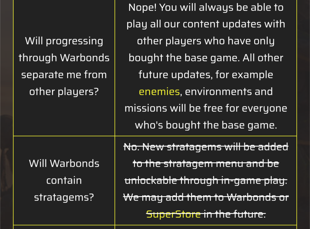 >>545082532>>545083498>new guns, armour passives, stratagems, and boosters aren't content because you need to pay for themI guess the entire fucking game isn't content because you have to pay for it to begin with