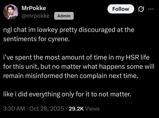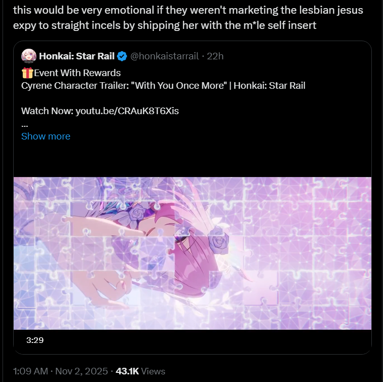 I don’t want to hate but it just baffles me how there is absolutely no substance to Cyrene other than wanting to be with Trailblazer 24/7. Not even the other “waifu baits” have this little of substance to them as a person. The voice is unbelievably monotone and the music is nice but nothing special. With how they are conveying in the trailer that the ring is the last puzzle piece they are not subtle about Cyrene is TB wife. They don’t even have her firing a single arrow at something with substance.I would’ve loved them conveying how her puzzle piece is Amphoreus. She can finally fight Irontomb and no longer can just watch Phainon suffering. The trailer should've conveyed her willingness to sacrifice herself for Amphoreus but instead her love is Trailblazing. She really inserted herself into the AE without knowing Welt or Himeko, peak parasocial relationship.