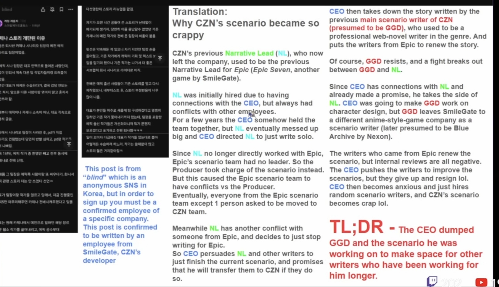 https://x.com/Brolist_kr/status/1984606978652717373Japanese actually done some research about what's going on in story department. 1. Lead writer wrote a story that was much darker, Lovecraft vibe, and time loop element2. Director was not pleased and rewrote a story himself, which includes his OC having love with Renoa.3. Lead writer rejected the new story, so director put to a vote.4. Of course, director won and lead writer's story was terminated. Thus, lead writer left the company.5. The rest of story crew tried to rewrite the story based on director's story, but his story was so shit, story team just gave up and left the company as well.6. Current story is literally 4-5th rewritten story.