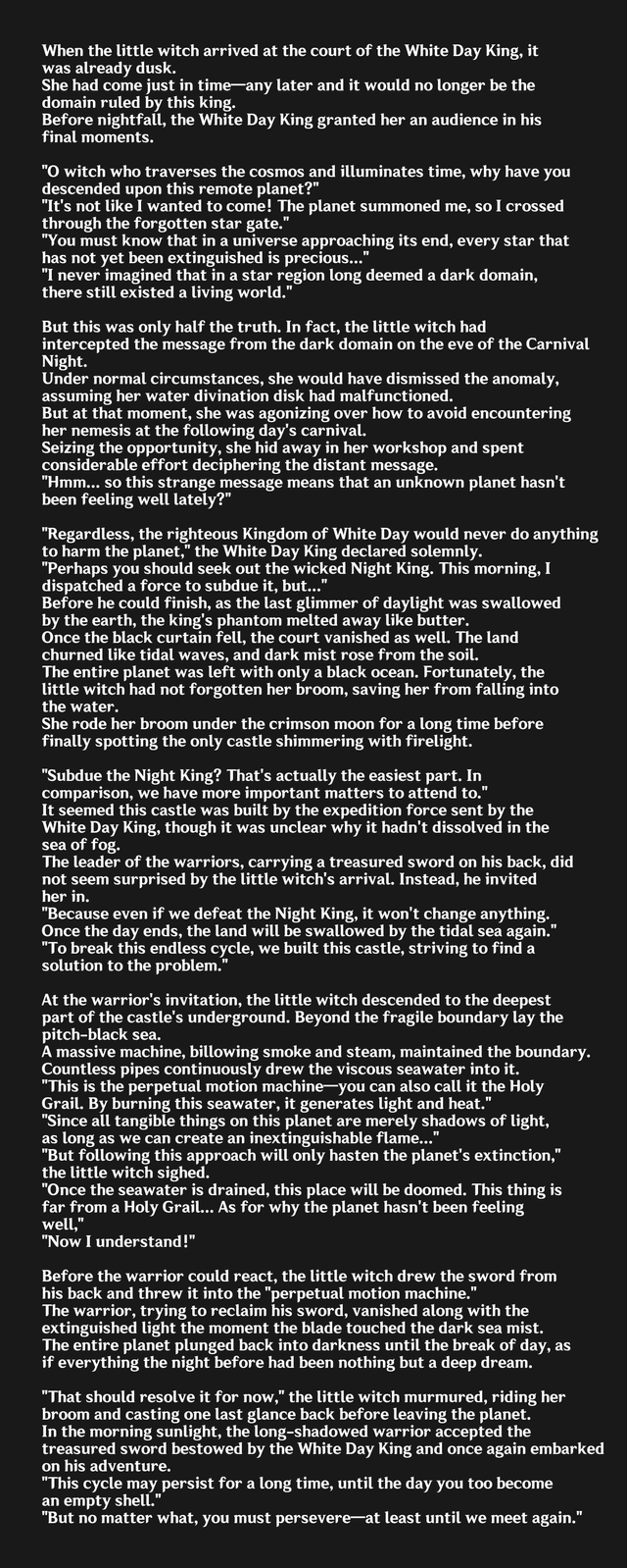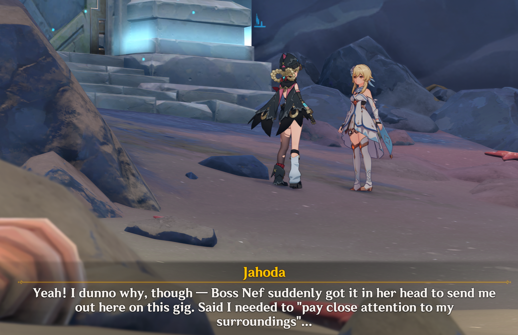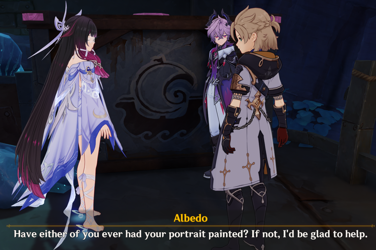 ??: Glad you could make it, Kootar.Kootar: Watch your tone with me, ??. You may be the ¿, but I'm still your superior as a goddess.??: As if I could forget. Listen, Kootar, there's something about the Abyss you should know. Oh no. It's too late. These people have all been infected. They may look fine now, but it's a matter of time before they turn into hilichurls!Kootar: What???: This entire civilization must be purged.Kootar: How can you even consider that? There's got to be some other way!??: Damn it, Kootar. As your future ¿, I order you to purge Khaenriah.Kootar: You are not my ¿ yet, ??. Nor would I obey that command if you were!??: Then I must consider this an act of blasphemy.Kootar: Blasphemy? Have you lost your mind, ?????: Have I? Lady Kootar, by my right of succession and sovereignty of my crown, I hereby relieve you from your command and suspend your angels from service.Il Capitano: ??, you can't just...??: It's done! Those of you who have the will to save this world, follow me. The rest of you... get out of my sight.Kootar: You've just crossed a terrible threshold, ??.??: Captain?Captain: I'm sorry, ??. I can't watch you do this.