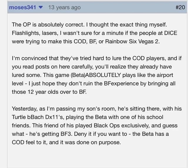 my first battlefield game was bad company 2 and i didn't like it cause bullets weren't hitscans so i didnt know how to play