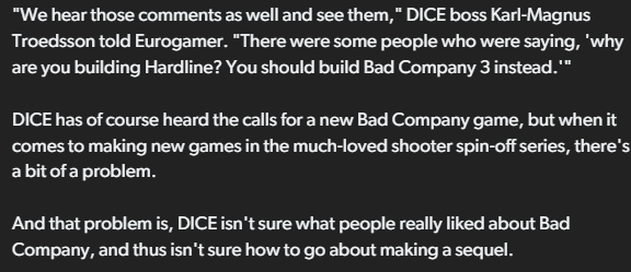 >>545227440What people love about Bad Company is that it's a simplified, casual, console focused experience, with a wacky campaign with quippy antiheroes