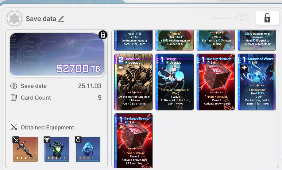 >>545162394Removing basic cards, adding Neutral cards (cards not native to the character), copies of cards, Divine Epiphanies, equipment will all bloat the save data size. There isn't a guarantee but try to balance them. E.g. don't take highter rarity gear or Neutral cards if you want more dupes of Divine Epiphanied cards.Epiphanies are per save data, triggers happen in battle and from some dialogue options in encounters. Epiphany choice is just RNG. No, Epiphanied cards are permanent.