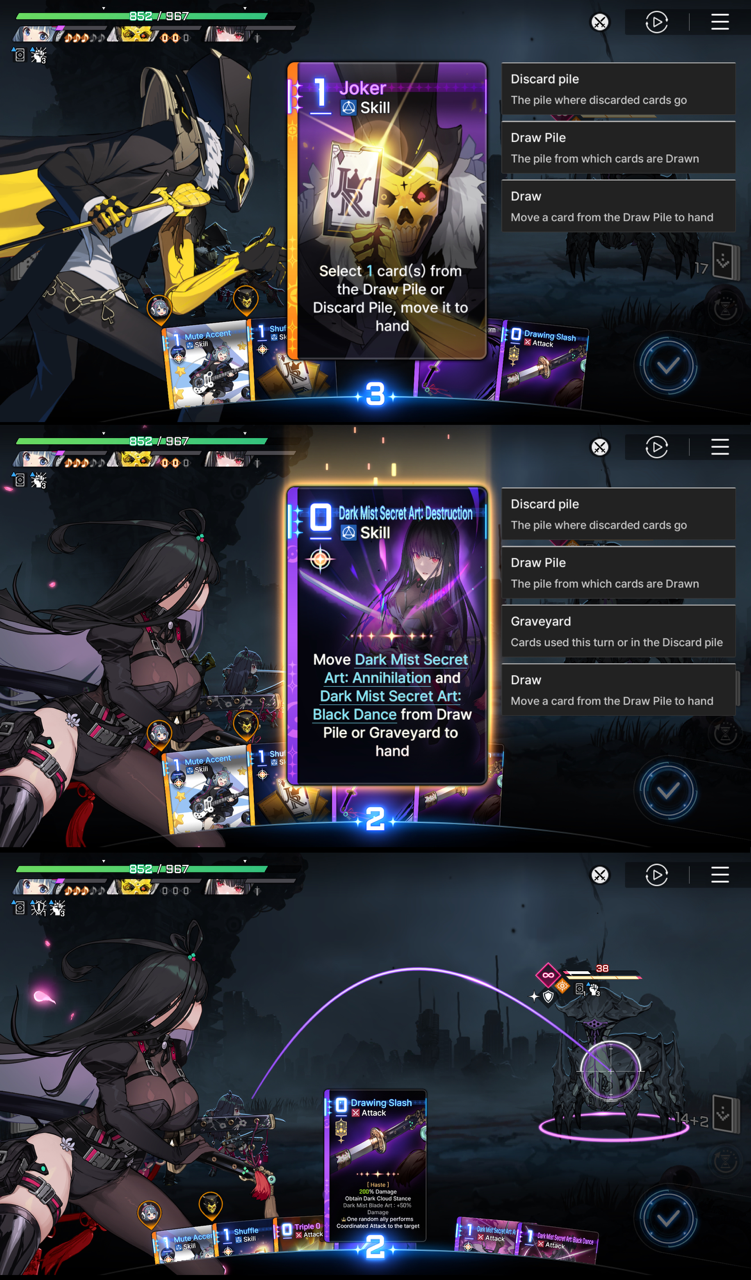>>545173192Units have simple decksExploring Chaos (roguelike mode) cause them to have epiphanies that modify the deck or get eaten by ghouls that eat your cardsClearing Chaos nets you a separate Save Data, this finished new deck. Difficulty determines how much is kept.Pic related is an example: she is Rin, whose cards are based around her exclusive Stance mechanic. The stance on cause her cards to get buffed but attacking with cards of someone else break stance and you will need to draw a card that activates stance againTherefore Rin pairs well with supports with card searching or draw power, that you won’t attack much with.Meanwhile the poster girl Renoa’s mechanics are involving Dirge Bullets that activate when discarded. So she is best paired with someone that has draw or discard cards for that, or someone that amps up Bullet card damage.