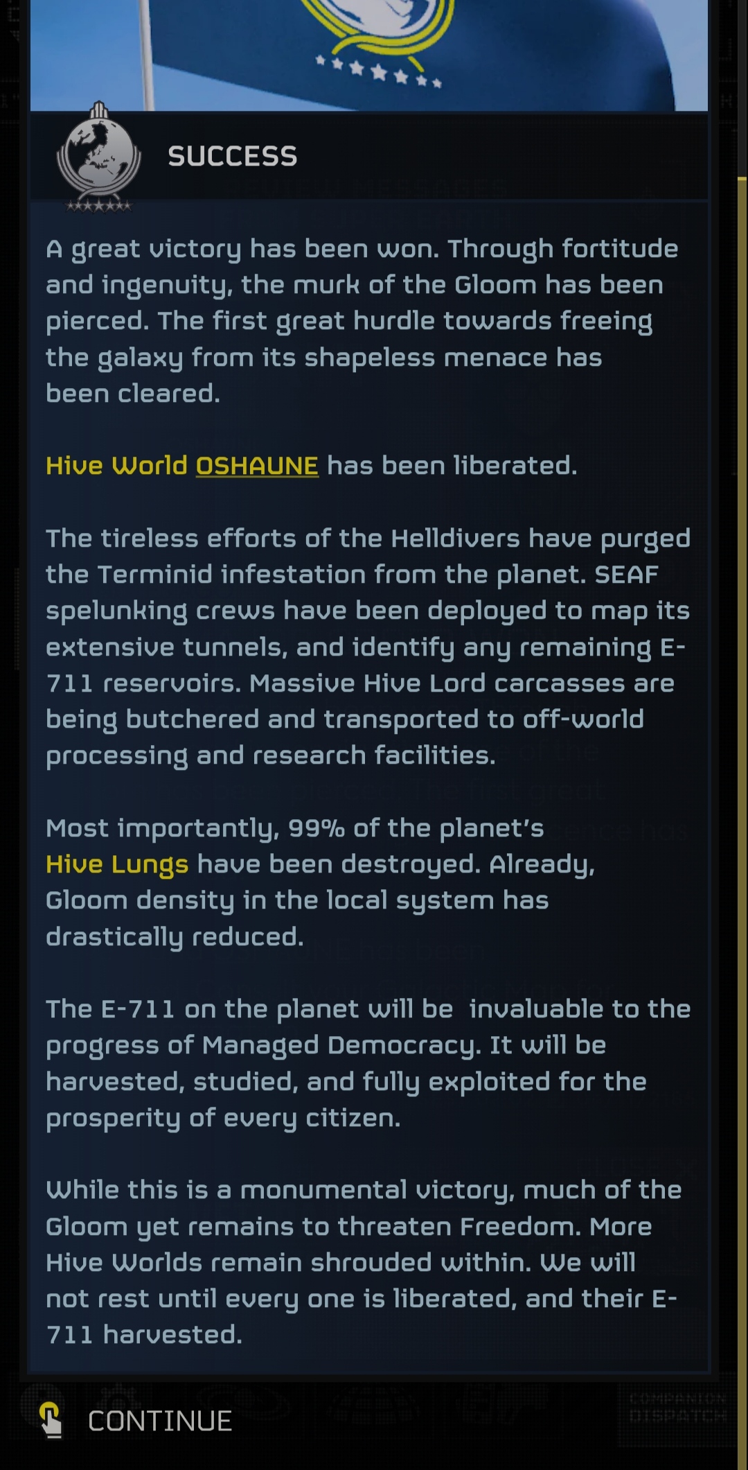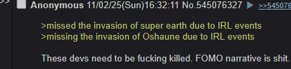Hope youre all ready for the inevitable>"HOLY SHIT, HELLDIVER!!!! THE GLOOM HAS FOUGHT BACK AND SENT AN INVASION TO OSHAUNE! GO DEFEND IT!"