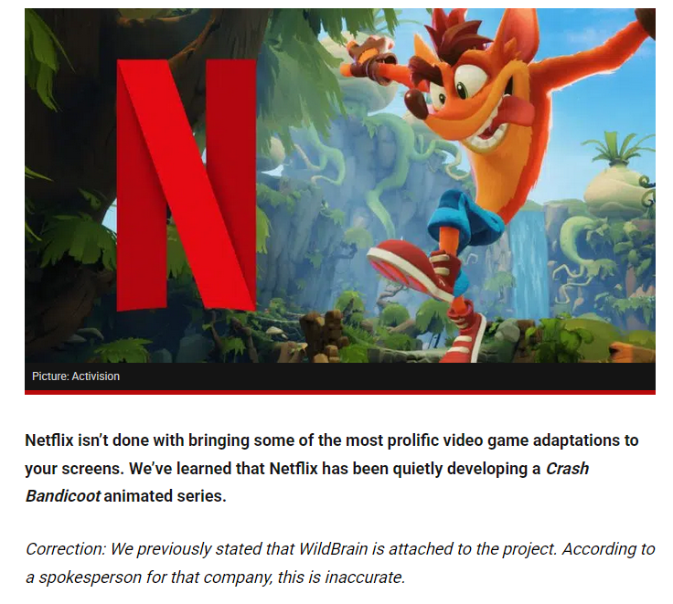 >>545253330Wildbrain straight up said, "No you lying sacks of shit".https://www.whats-on-netflix.com/news/crash-bandicoot-animated-series-in-the-works-at-netflix/Nobody seems to notice the added correction.
