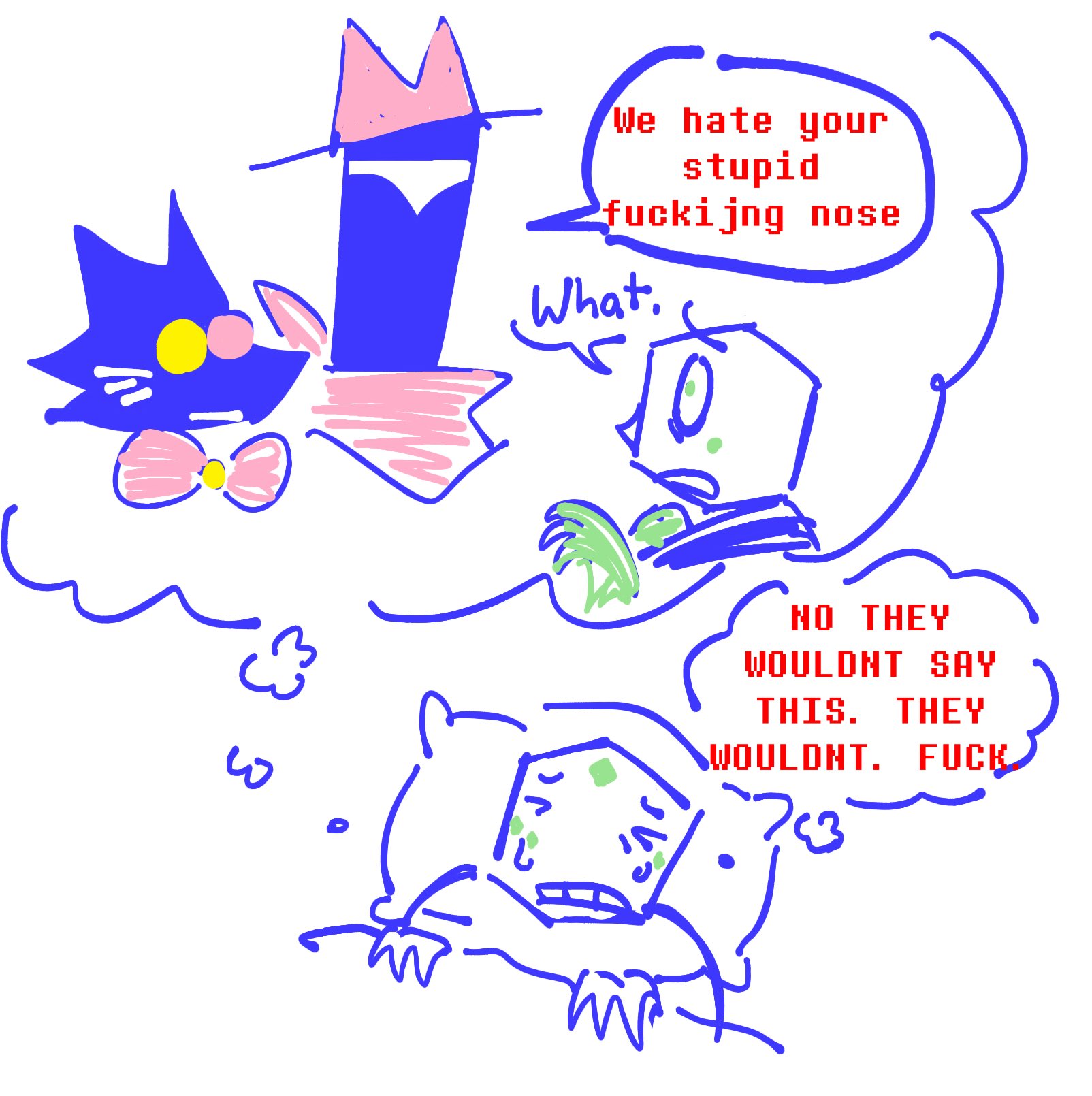 Hey voiceanon, if you're still here, can you do Berdly introducing Kickassia to Susie, but Susie doesn't really get the appeal of it?