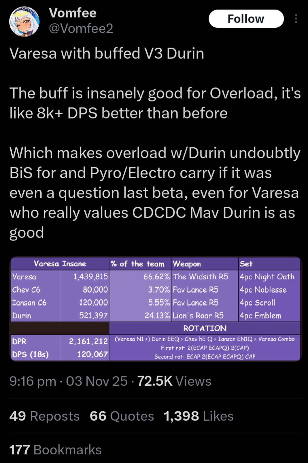 >>545243093According to the calcs, solo Durin is better than Durin+anybody for now. They made Wanderer too Faruzan depended. He really needs some balance fixes to get rid of her.