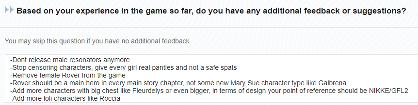 >Survey is here>Ask again for IR>Ask again to not show everything on the map and have at least some sense of exploration instead of blindly following markers without ever exploring the map yourself>Ask again to do both a msq and a companion quests instead of calling a companion quest a msq>Ask again to do more skinsI think I've been asking most of this since 2.0 or 2.1, and it's tiring. I can only be a cuck for so long, so unless there are any signs of listening on these in 3.0, I will just drop it. I don't see any point in playing a game that doesn't care the slightest about whales like me.You guys are shitting on mihomo and their fans but Kuro is the same