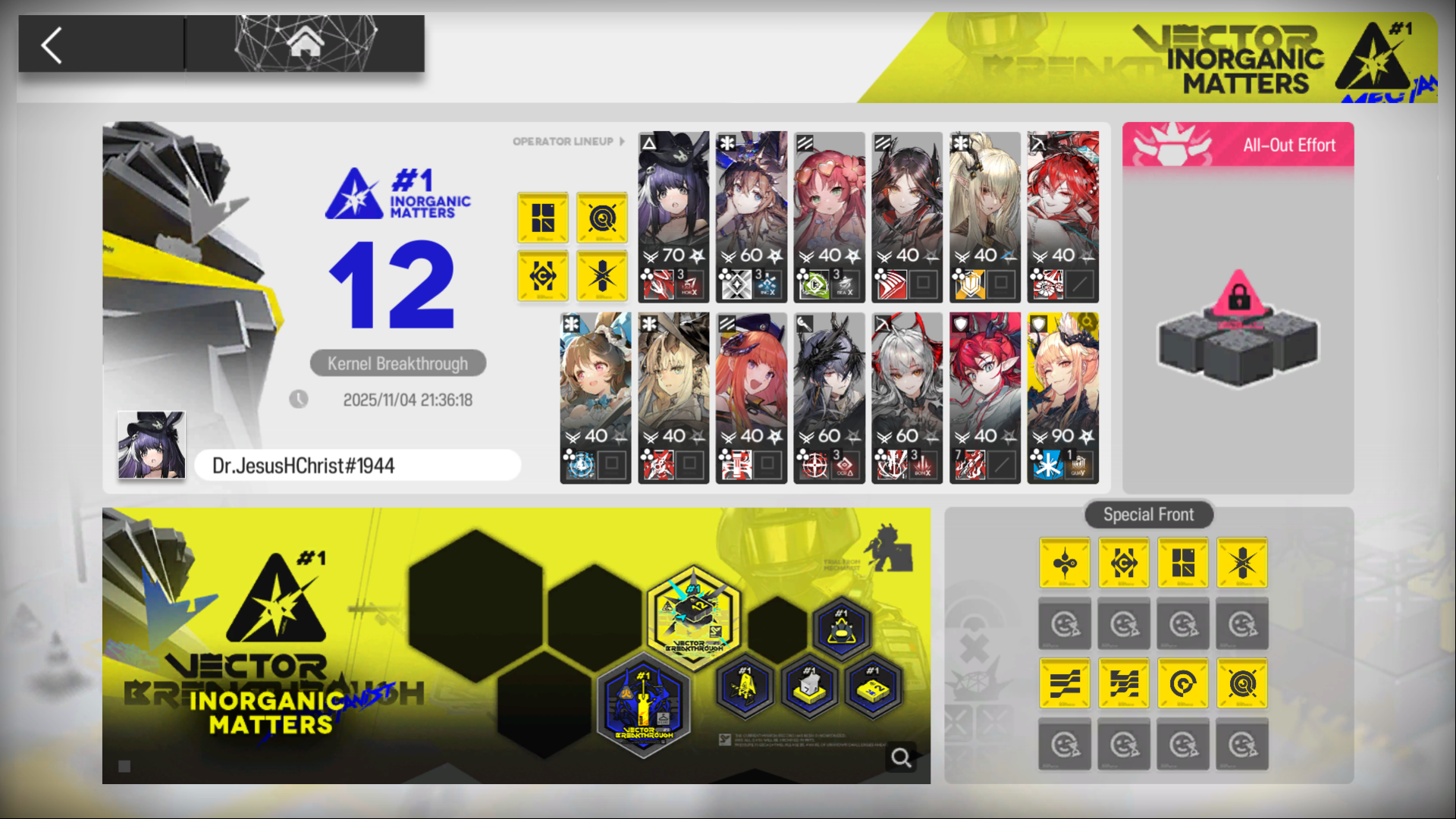 [11/14-11/28][Orienteering Headhunting]6* Guard Ulpianus, 6* Supporter Tragodia, 6* Supporter Stainless, 6* Sniper Narantuya, 6* Caster Nymph, 6* Guard Młynar, 5* Vanguard Mitm, 5* Guard Gracebearer, 5* Vanguard Poncirus, 5* Defender Bassline, 5* Medic Hibiscus The Purifier, 5* Caster Aroma