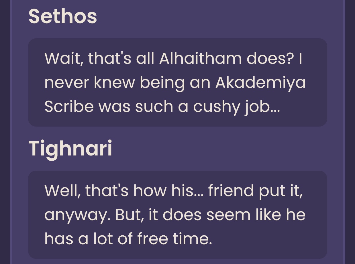 Development wise, she's the most one note character in the game that actually ever getting a main focus in the arc, her love for humanity essentially defined her character and take that shallow trait that barely getting explored further than a basic level away and you've a little to no substance characterization.