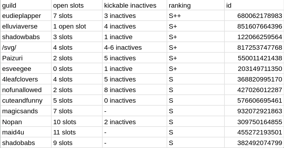 JO Kings and ESL GANG anons, you should have seen a message in your respective chats about the mergers ongoing. please take your pick from one of the following guilds. if a guild has 0 slots, it may still have week-long inactives the danchous are willing to kick, so ask in the thread.680062178983 - EudiePlapper851607664396 - Elluviaverse122066259564 - Shadowbabs817253747768 - /SVG/550011421438 - Paizuri203149711350 - EssVeeGee368820995170 - 4LeafClovers427026012287 - NoFunAllowed576606695461 - CuteAndFunny932072921863 - Magic Sands455272193501 - Maid4U382492074799 - Shadobabs