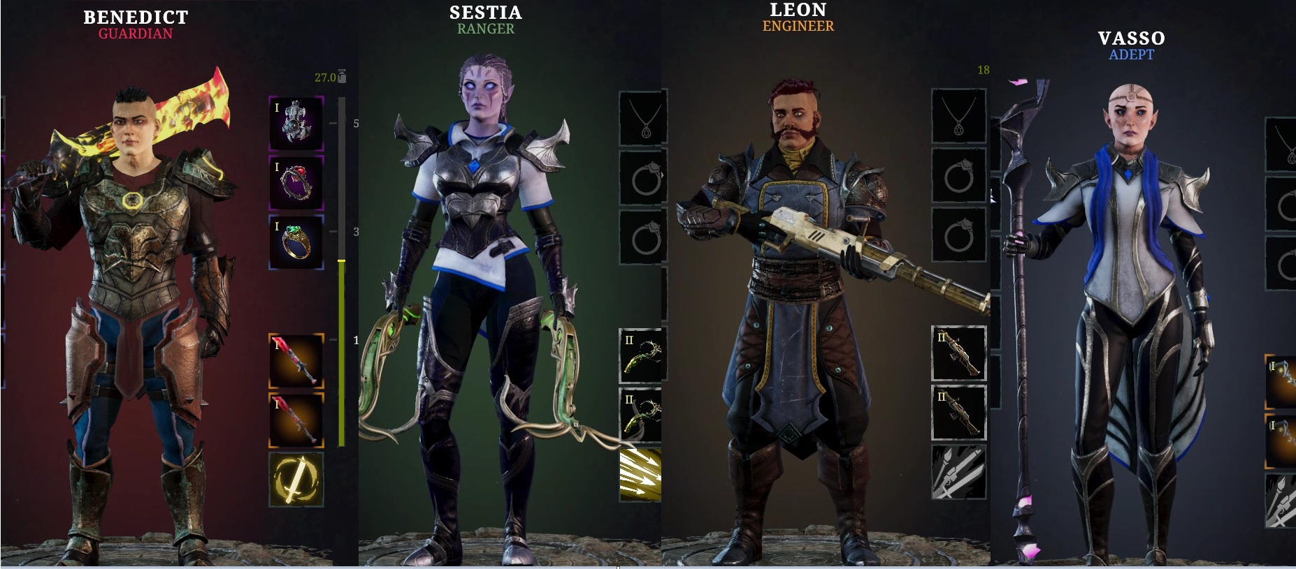 So besides the two siblings you can customize, here are the 4 main Dark Envoy companions. From what I''ve heard there are two more mutually exclusive ones that depend on which of the competing factions you side with, so the total number is 5 + your two siblings (who have their own personality as well and are not blank slates - reminder there are no dialogue options apart from making major choices the characters act out the rest on their own, but there is decent reactivity for all of the choices so far). Also they cover each of the 4 base classes and you choose their specializations.