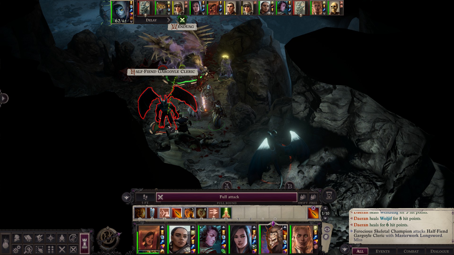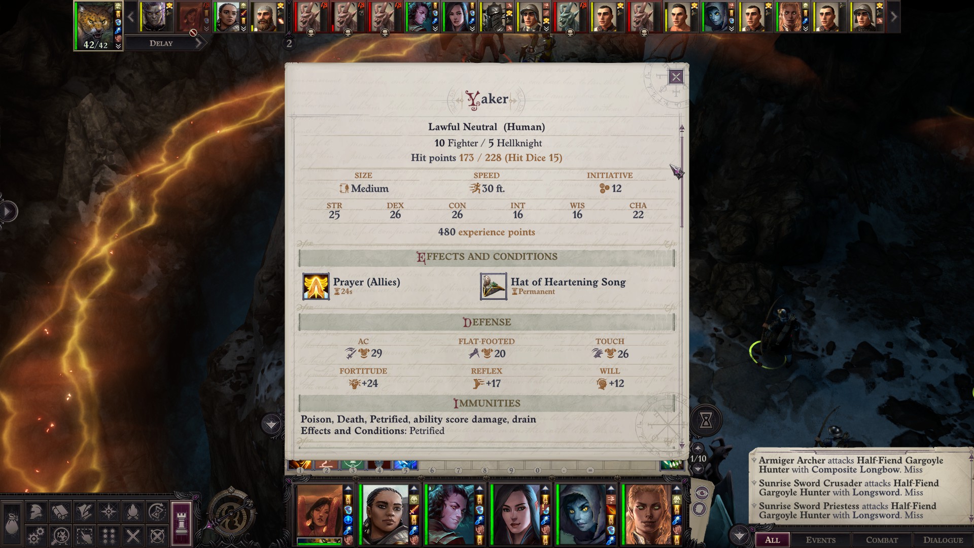 This encounter was damn rougher than I remembered on hard. It's just dozen or two gargoyles, but they all rush KC - and if you let them get a full attack in it's over. Mirror image helps to survive for one turn, but I need a turn to cast stuff to deal with rest of dozen gargoyles.And if you let them down you, the equally tanky clerics will just deal you in with channels>Not even stoneskin helps since half of the 'goyles are half-fiends or something that can Smite Evil and ignore all damage reduction that wayIt's not always easy being Neutral Good.Thank god I randomly picked up Freedom of movement scrolls out of a whim, dealing with hold person cancer would've been impossible