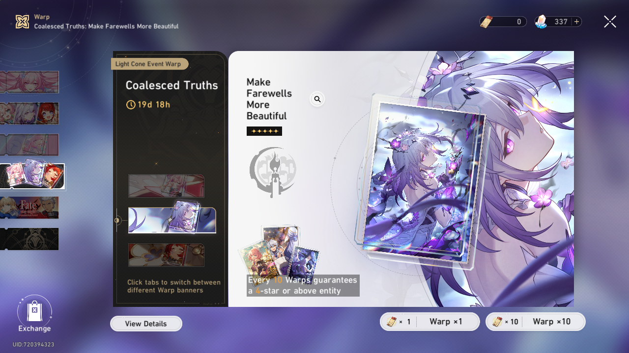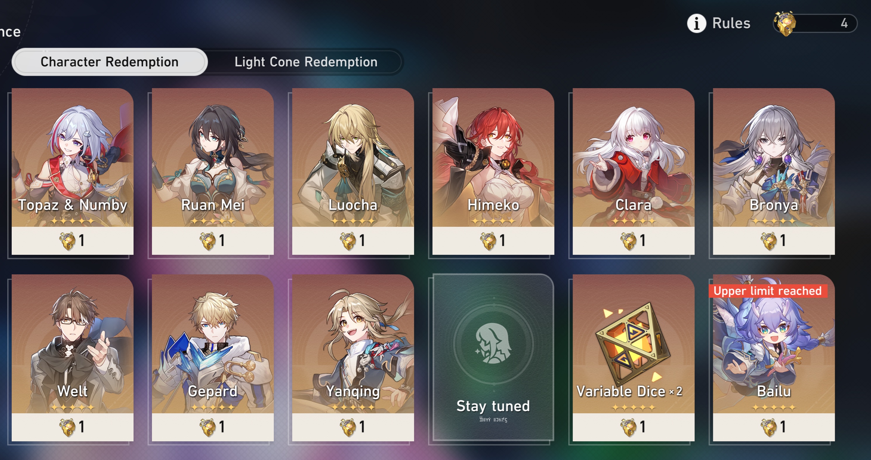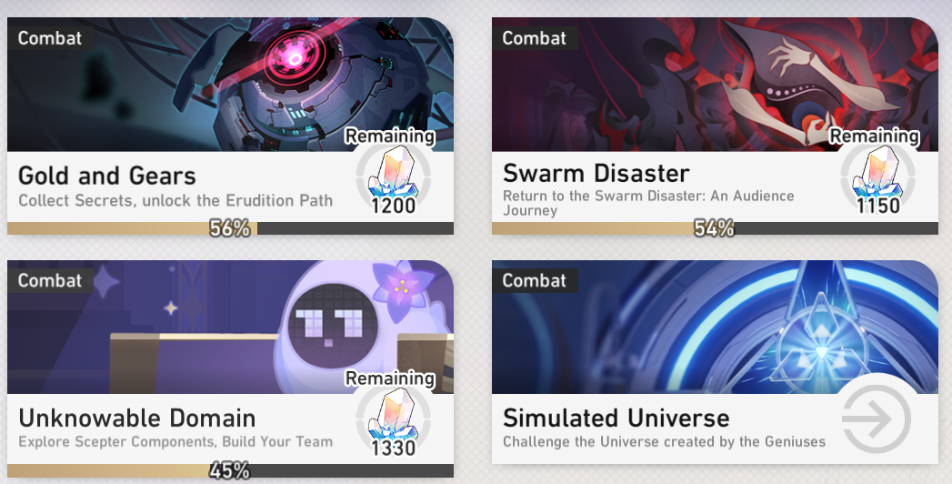 >Current Character Banners: Cyrene, Hyacine, Castorice, Tribbie + Pela, Lynx, Moze - https://www.hoyolab.com/article/41938646