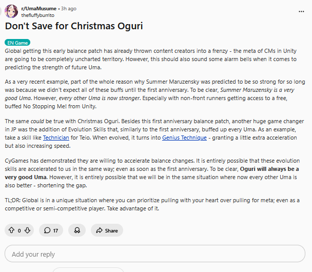 LADIES AND GENTLEMEN:https://youtu.be/N-aAHBllMWA?si=lJVg912tDvGm6_nvIt's up.Big highlights since the game is re-solved:>R RIKO BUFFED AND NO STOPPING ME ULTRA BUFFED, AOHARU IS FREE BECAUSE OF THIS, RICE IS NOW DOGSHIT>LATE SURGERS NOW META, NICE NATURE WIT STILL TOP TIER BECAUSE OF THIS + MANT DOMINANCE >FOCUS SHOULD BE ON MANT SINCE AOHARU IS FREE, REMEMBER KITASAN IS NOT META IN MANT, MANT IS MOST F2P-FRIENDLY SCENARIO IN THE GAME SO ANYONE COMPLAINING ARE WHALES - NTR IS ACCOUNT PRIO FOR CREEKLETS>GUTS BUFFS IRRELEVENT IN AOHARU, DO NOT USE HARU YET>WARNING: WITH ACCELERATED GAME MECHANICS WE MAY GET RED SKILLS EARLY, XMAS OGURI WILL NOT BE META, ROLL FOR MEJIRO DOBER NOW