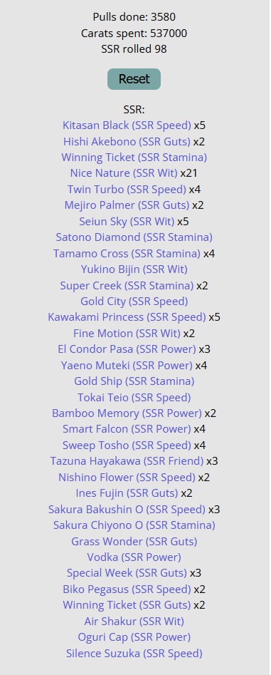 >highrolled stats on a fan farm run with 2 speed 2stam 2wit deckGuess all my runs for Aoharu will be shit