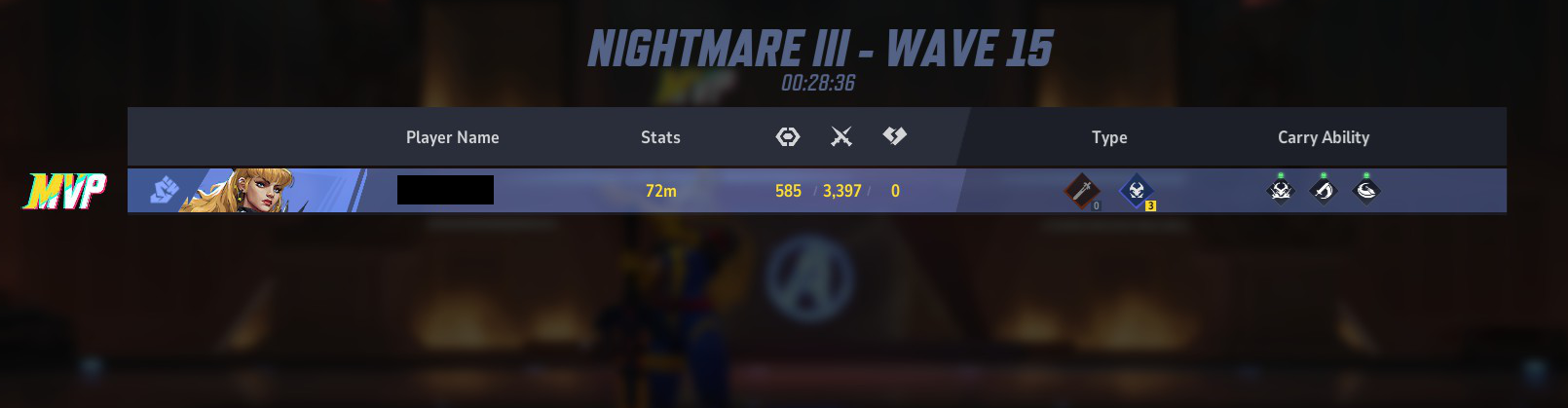 >Blade - 31:05 - 72m - 550 / 3389 / 1>Thor - 24:52 - 72m - 550 / 3390 / 3>Magik - 26:10 - 72m - 550 / 3394 / 1>Punisher - 23:50 - 71.1m - 550 / 3367 / 2>Jeff - 22:13 - 72m - 550 / 3393 / 0I imagine N4 is a bitch solo though.