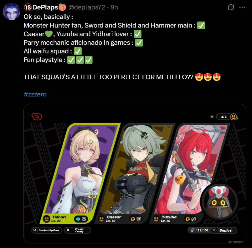 Previous: >>545521470 >NewsAgent Record | Banyuehttps://www.hoyolab.com/article/41700148Agent Record | Dialynhttps://www.hoyolab.com/article/41681910Version 2.3 Special Programhttps://youtu.be/uTWIK77TcdI >Newest Trailer/Teaser/Character demohttps://youtu.be/_Zo_zbHmOpI (EN)https://youtu.be/begsPfi50BY (JP)https://youtu.be/G-dkyslN_4s (EN)https://youtu.be/ovdNs4GBg9o (JP)https://youtu.be/NCzUV95VIEIhttps://youtu.be/CQBbCfxIgnY (EN)https://youtu.be/wutoIFoyZGU (JP) >Upcoming Events for 2.3https://zenless.hoyoverse.com/en-us/news/160259All-New Program 10/14 - 11/25The Inverted Night Lantern 10/14 - 11/24When Dreams Remain Unfinished 10/17 - 11/24SNAP! Shining Strike 10/22 - 11/10Timesworn Hills Explorer's Guide 10/14 - 11/26Advanced Bounty: Routine Cleanup 10/29 - 11/03"En-Nah" Into Your Lap 11/05 - 11/25Chronicle of Counseling 11/05 - 11/17141 Eco Art Exhibition 11/12 - 11/24Data Bounty: Combat Simulation 11/19 - 11/24 >Redeemable codes (claimable in-game or online)https://zenless.hoyoverse.com/redemptionZENLESSGIFTZZZ23SWEETILY >Resources and useful linkshttps://rentry.org/zzzlinkshttps://rentry.org/ZZZ-Friendshttps://interknot-network.com >/zzz/ OP pastebin (use this if making new thread):https://pastebin.com/PzbMf13P
