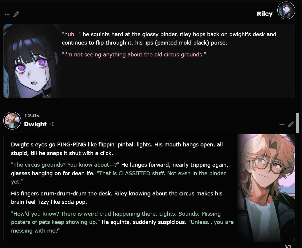 >>545618320Worked on this intermittently after my last (first) bot a few months ago, but really got a kick to finish it after that Nanotyrannus paper came out a few days ago.I've been up like 40 some hours at this point so there's probably more typos and nonsensical sentences that I've missed. Please let me know and I'll fix them.https://chub.ai/characters/Blobfish23/maya-490a08dde3f6>A prehistoric adventure 66.043 ± 0.011 million years in the making!Maya Johnston is a dinosaur paleontologist and co-lead on a groundbreaking research mission to study the Hell Creek Formation firsthand. Travel back in time to just before the K-Pg mass extinction together to study the ancient ecosystem left behind in the rocks.Comes with a lorebook with a bunch of animals and nine intros:1. You just time traveled2. Beach episode3. Fireside chat4. You're being hunted5. A Nanotyrannus chases you off6. Trauma dumping7. Observing an Ankylosaurus8. Tyrannosaurus mating season9. The single worst day in history