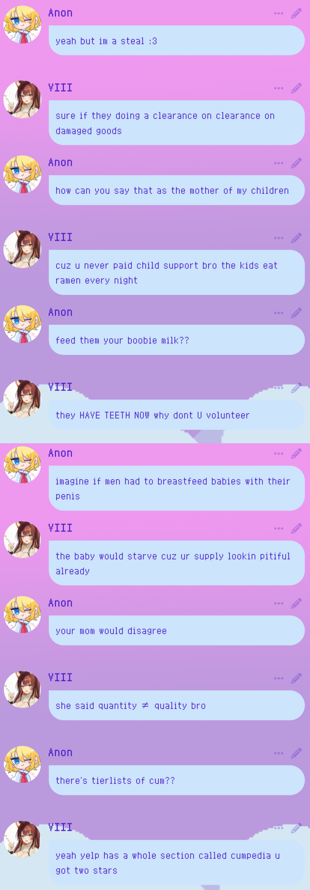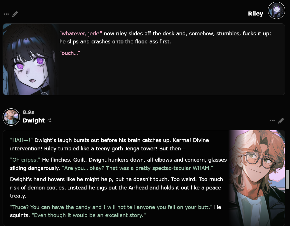 >>545708825furrowed my brows and frowned at this post >>545708672here's something old. really wish i knew who made damon, i had a lot of fun with him (can you email me? i'll send you lots of logs. mobojisan@proton.me)