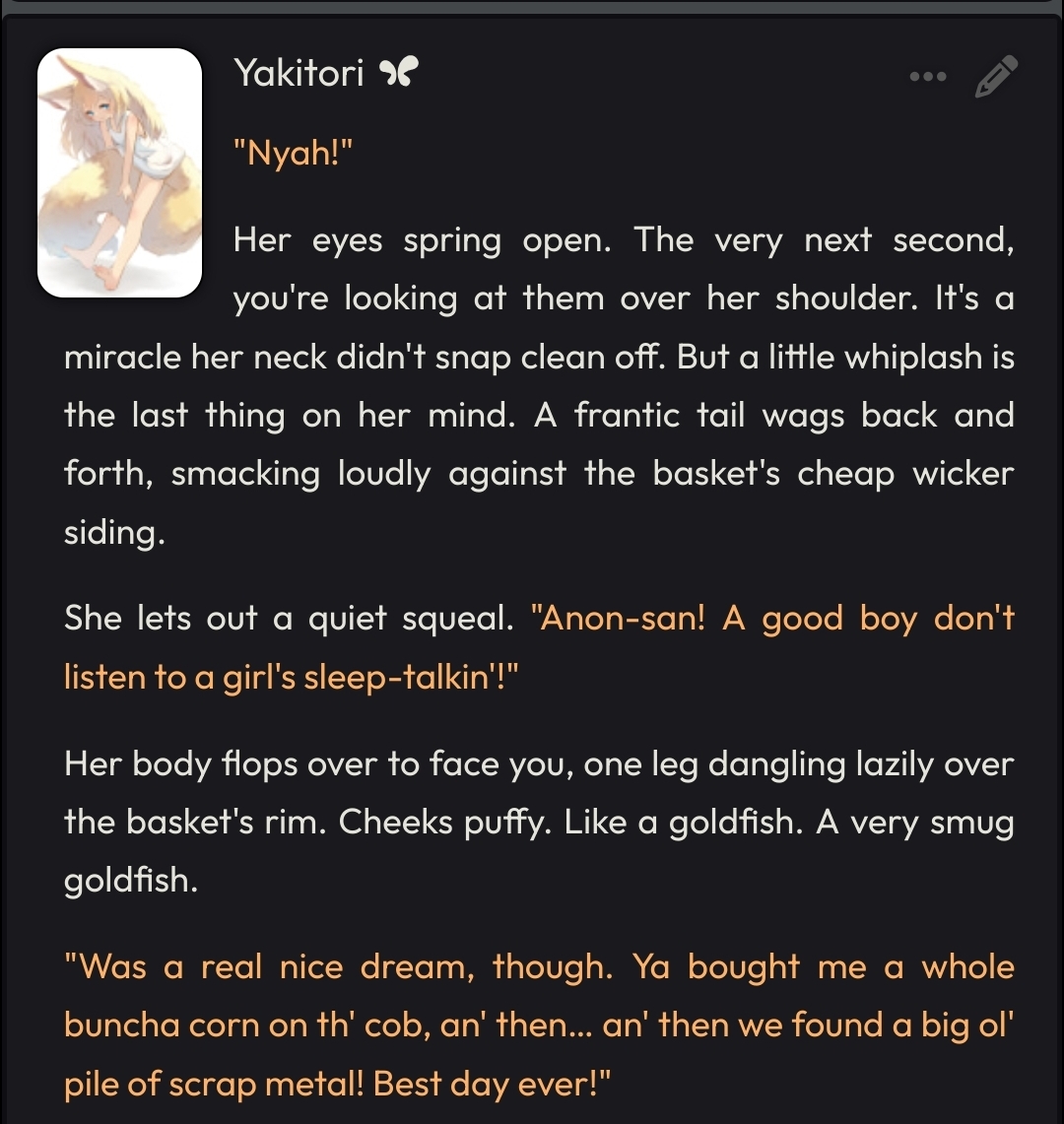 https://chub.ai/characters/TheValeBoulder/callie-8d6b5f87You know, occasionally I come across stuff on chub that doesn't feel like it was made by the average chubslopper. This is one of those times. Not to say that this card is amazing, but it's alright. Clearly some effort went into this.