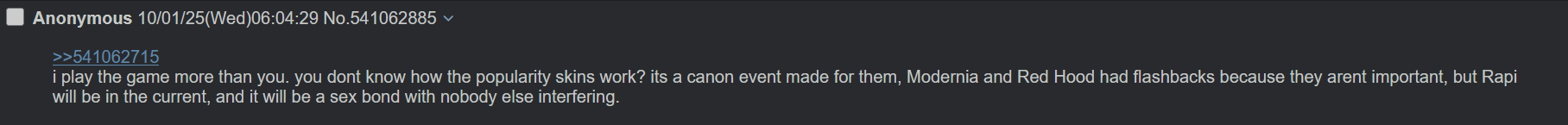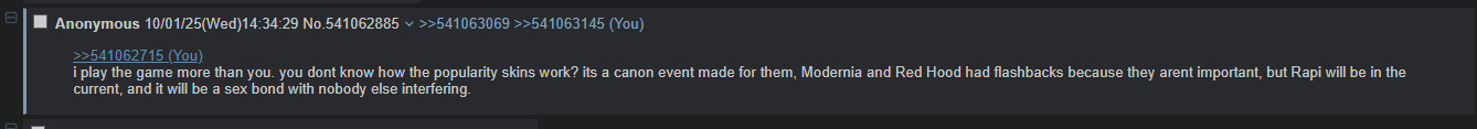 >>545640625Gaslit themselves because of the Siren update being a girl's sleepover. Meanwhile as soon as Siren meets SKK she's spilling spaghetti.
