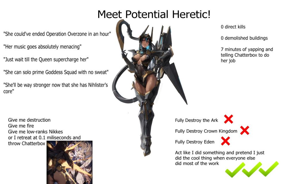 >>545666686It's fucking retarded. They keep saying that the queen needs a new, strong body and then their entire plan is to deliver the body of the strongest nikke every built to the queen.