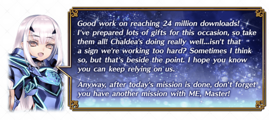 Previous >>545547816>[Campaign] Story Clear Support Campaign 2025: Part 42025-10-21 21:00 PDT - 11-04 19:59 PSThttps://webview.fate-go.us/2025/1019_mq_support_cp4/[Campaign] Ordeal Call New Duties Unlocked: Part 4https://webview.fate-go.us/iframe/2025/1102_ordeal_call_cp4/2025-11-04 20:00 - 11-19 19:59 PST (GMT -8)[Summon] "Ordeal Call New Duties Unlocked: Part 4" Pickup Summon2025-11-04 20:00 - 11-12 19:59 PSThttps://webview.fate-go.us/iframe/2025/1102_ordeal_call_cp4_pu/[Campaign] 24 Million Downloads Campaign2025-11-06 20:00 - 11-20 19:59 PSThttps://webview.fate-go.us/iframe/2025/1104_24mdl/[Summon] 24 Million Downloads Mélusine (Lancer) (Tam Lin Lancelot) Pickup Summonhttps://webview.fate-go.us/iframe/2025/1104_24mdl_pu/2025-11-06 20:00 - 11-20 19:59 PST>[News]https://webview.fate-go.us/>[Servant Info]Servant Material Lookup: https://fgosim.github.io/Material/Servant Planner: https://github.com/chaldea-center/chaldeaCoin Calculator: https://fgo-servant-coins.glitch.me/index.htmlRank Up + Interlude Timeline: https://kazemai.github.io/fgo-vz/relate_quest.htmlRate Up Tracker: https://tohnocoding.github.io/fgobanners/>[Mats/Summoning Info]Rateups in FGO JP: https://files.catbox.moe/lf1qmz.pngQuartz for next Summer: https://docs.google.com/spreadsheets/d/1iRH60QpLNvHy9MMDKLJGNSg4s7FsDfdXtJtOUVDj5po/edit?gid=162156045#gid=162156045FGO Event Compendium: https://docs.google.com/spreadsheets/d/1qvxLU407QwiFaCvItqR16SqqAVlLD5u5nBzY_bCFYvs/edit#gid=2111060397Drop Rates: https://docs.google.com/spreadsheets/d/1_SlTjrVRTgHgfS7sRqx4CeJMqlz687HdSlYqiW-JvQAFGO Raw Database: https://apps.atlasacademy.io/>[FAQ]https://rentry.org/alter-faq