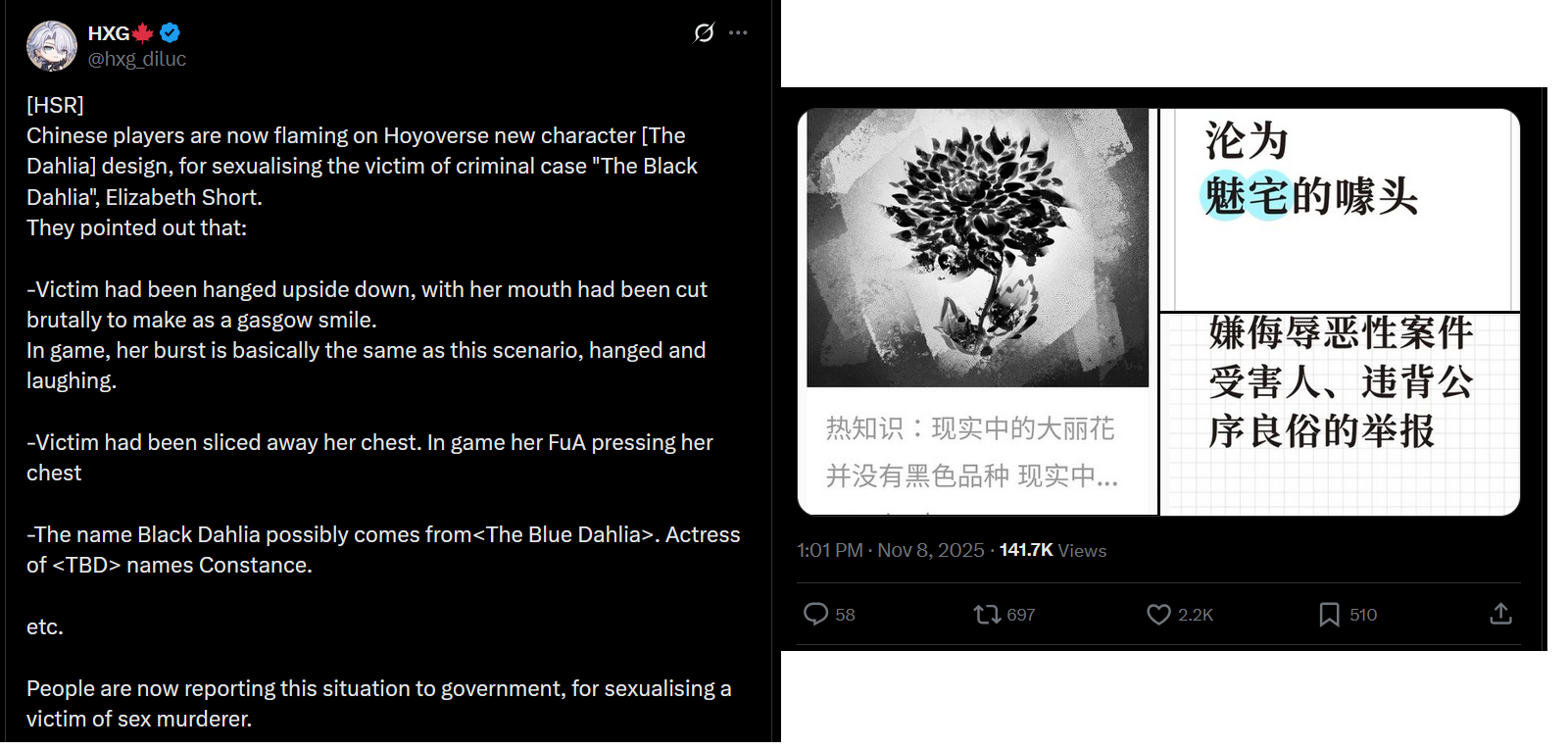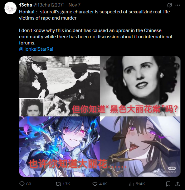 Chinese players are now flaming on Hoyoverse new character [The Dahlia] design, for sexualising the victim of criminal case "The Black Dahlia", Elizabeth Short.They pointed out that:-Victim had been hanged upside down, with her mouth had been cut brutally to make as a gasgow smile. In game, her burst is basically the same as this scenario, hanged and laughing.-Victim had been sliced away her chest. In game her FuA pressing her chest-The name Black Dahlia possibly comes from<The Blue Dahlia>. Actress of <TBD> names Constance.etc.People are now reporting this situation to government, for sexualising a victim of sex murderer.