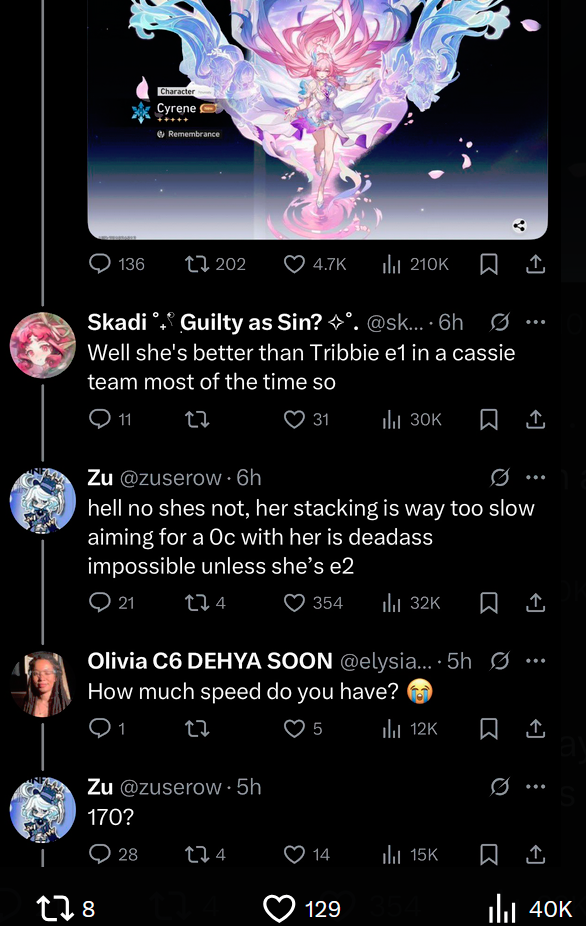 It's kind of cruel how they made both Hyacine and Cyrene want high speed, yet only gave 1 12% speed cone. It makes it very hard to build Hyacine without her cone, because a slow Cyrene is t5.