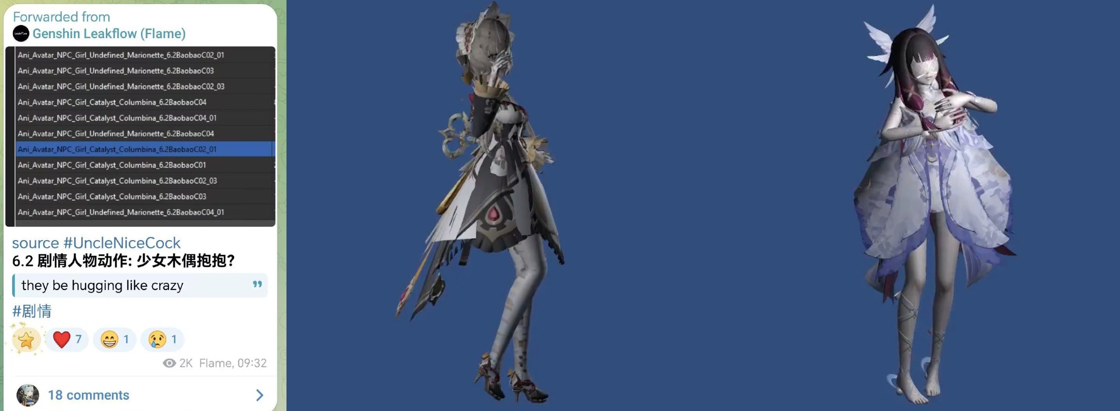 >>545743092Both Bina and Sandy have animations for a supposed hugging scenehttps://t.me/GenshinLeakflow/17111?